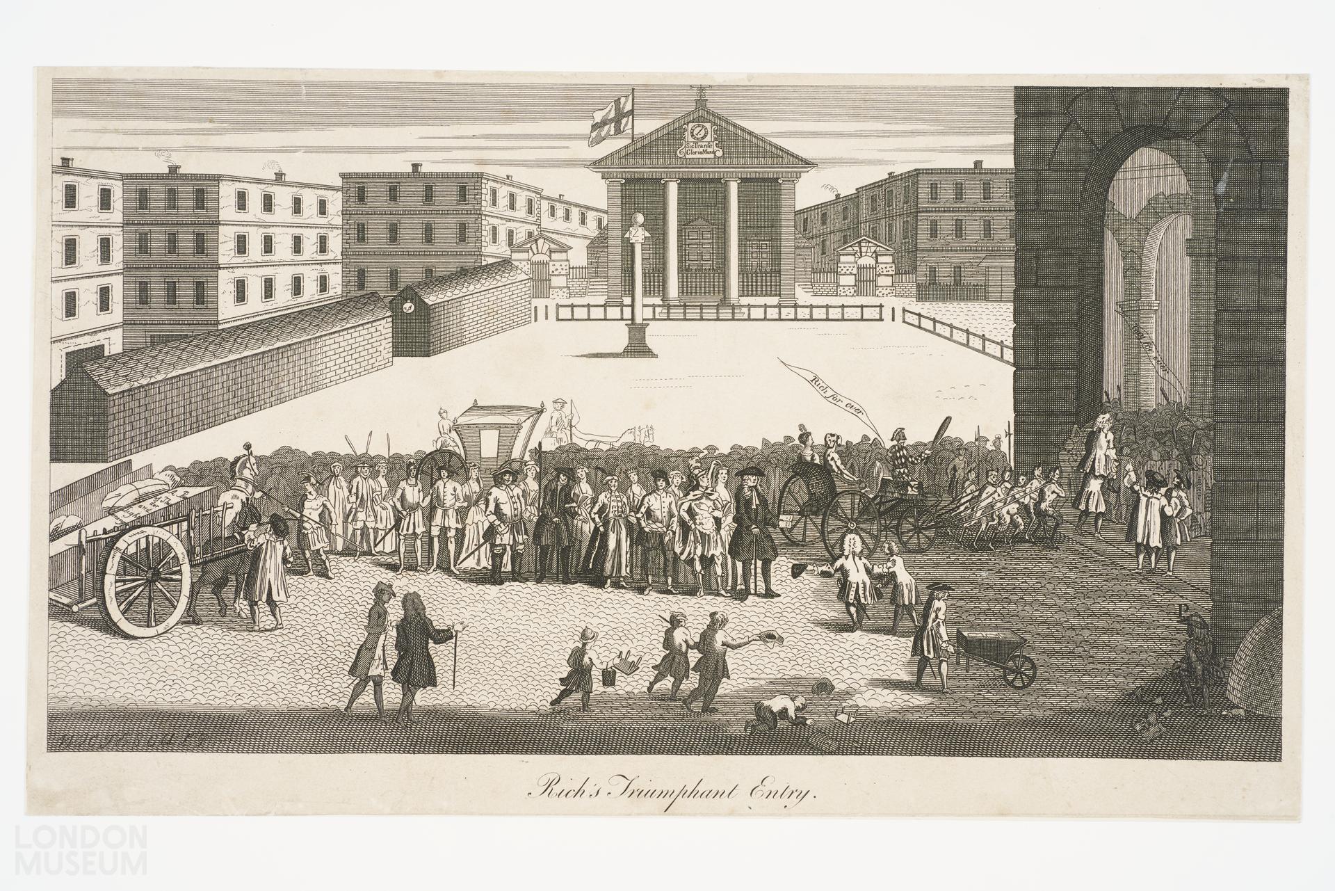 Probably a later reproduction of BM Satire catalogue no. 1899/1900/1901. Covent Garden: John Rich and his company make their "Triumphal Entry" to the Covent Garden theatre, 18/12/1732, transferring from the theatre in Lincoln's Inn Fields. Cf A6945.