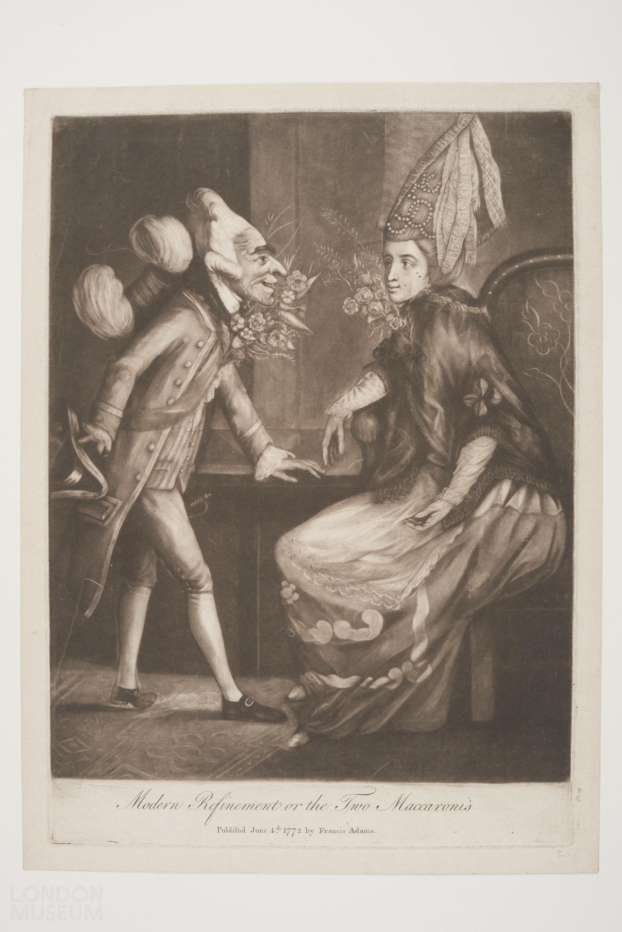 Modern Refinement or the Two Maccaroni's. Published 4th June 1772 by Francis Adams. Shows interior with a couple leering at each other - the man's wig has an enormous extension on his back, while hers extends upwards.