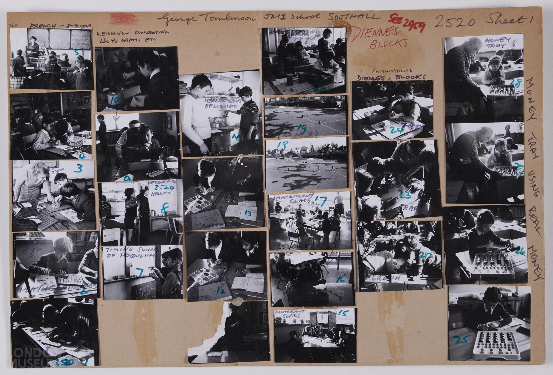 George Tomlinson JMI School, Southall, 1968, 1969. Images of various shots of classroom activities and exterior, including learning to use money and remedial classes, also Lathom JMI School, East Ham. Contacts numbered 1-5, 6 is missing, 7-20, 21 missing, 22-28. Sheet 1 of 2.