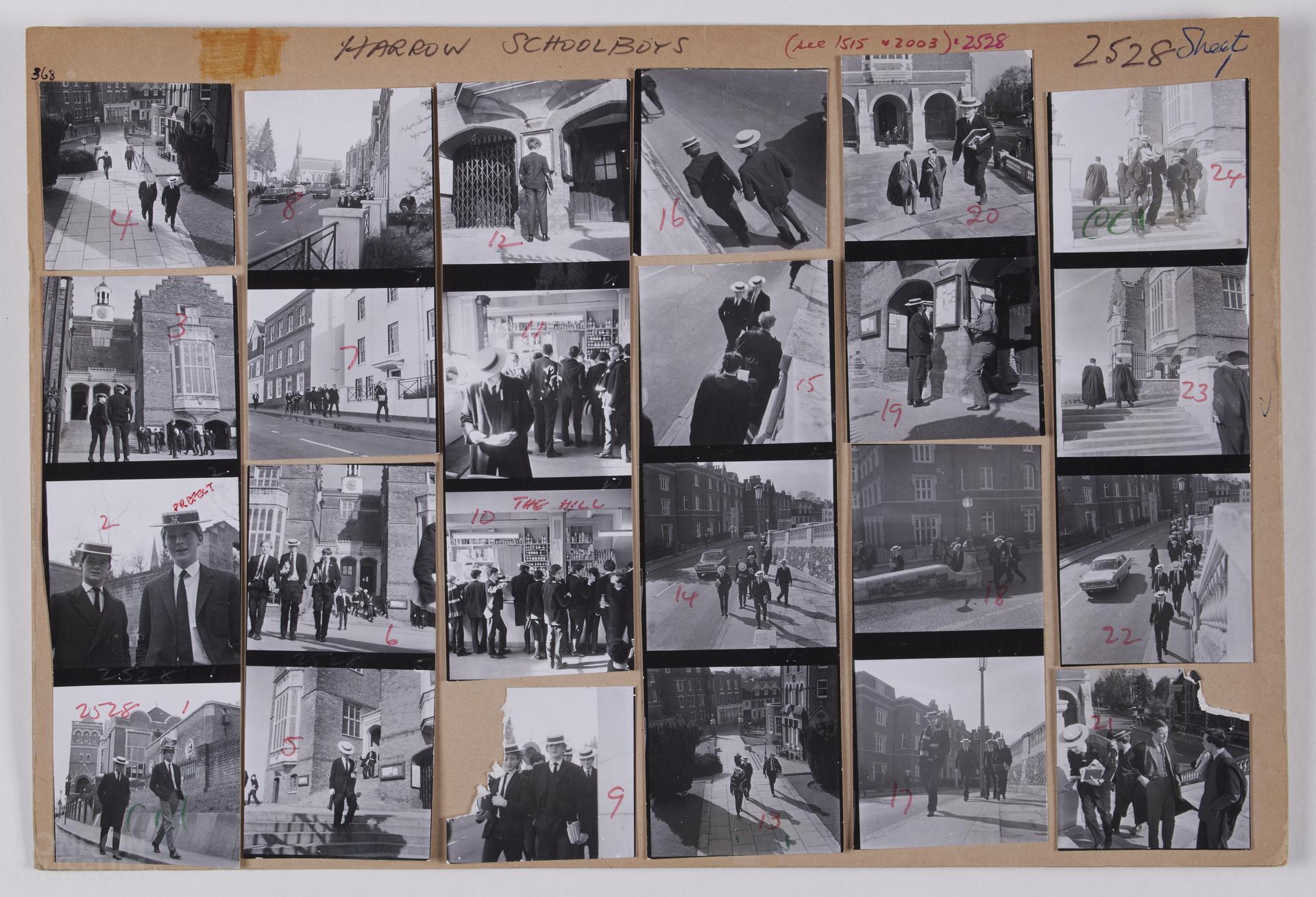 Harrow Schoolboys, 1968. Images of uniformed schoolboys and masters on school premises and in local streets. Contacts numbered 1-24. Sheet 1 of 2.