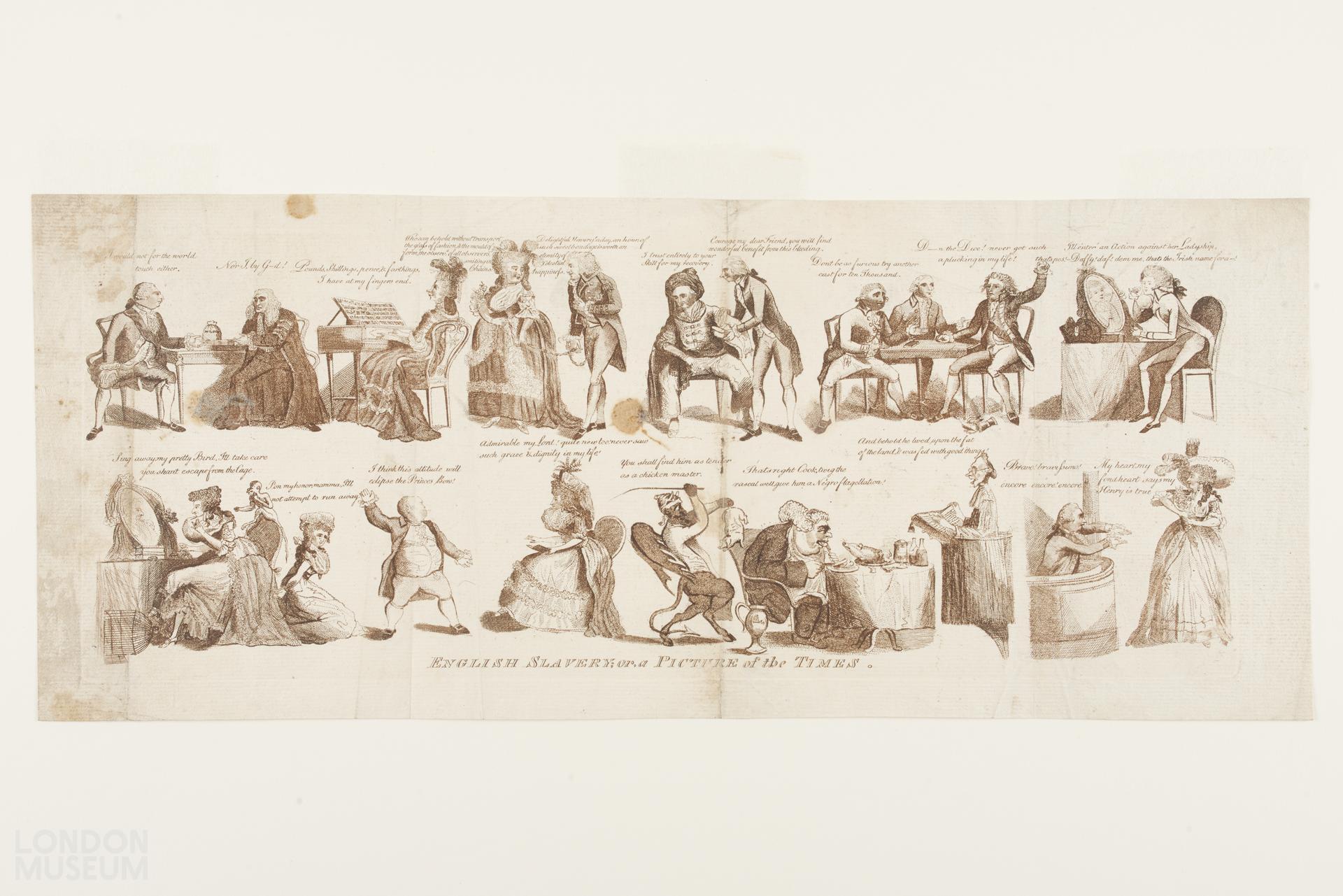 'English Slavery or a Picture of the Times.', strip design in manner of Burbury's Long Minuet. Title reflects the agitation for abolition of the slave trade. BM cat. 7301A.