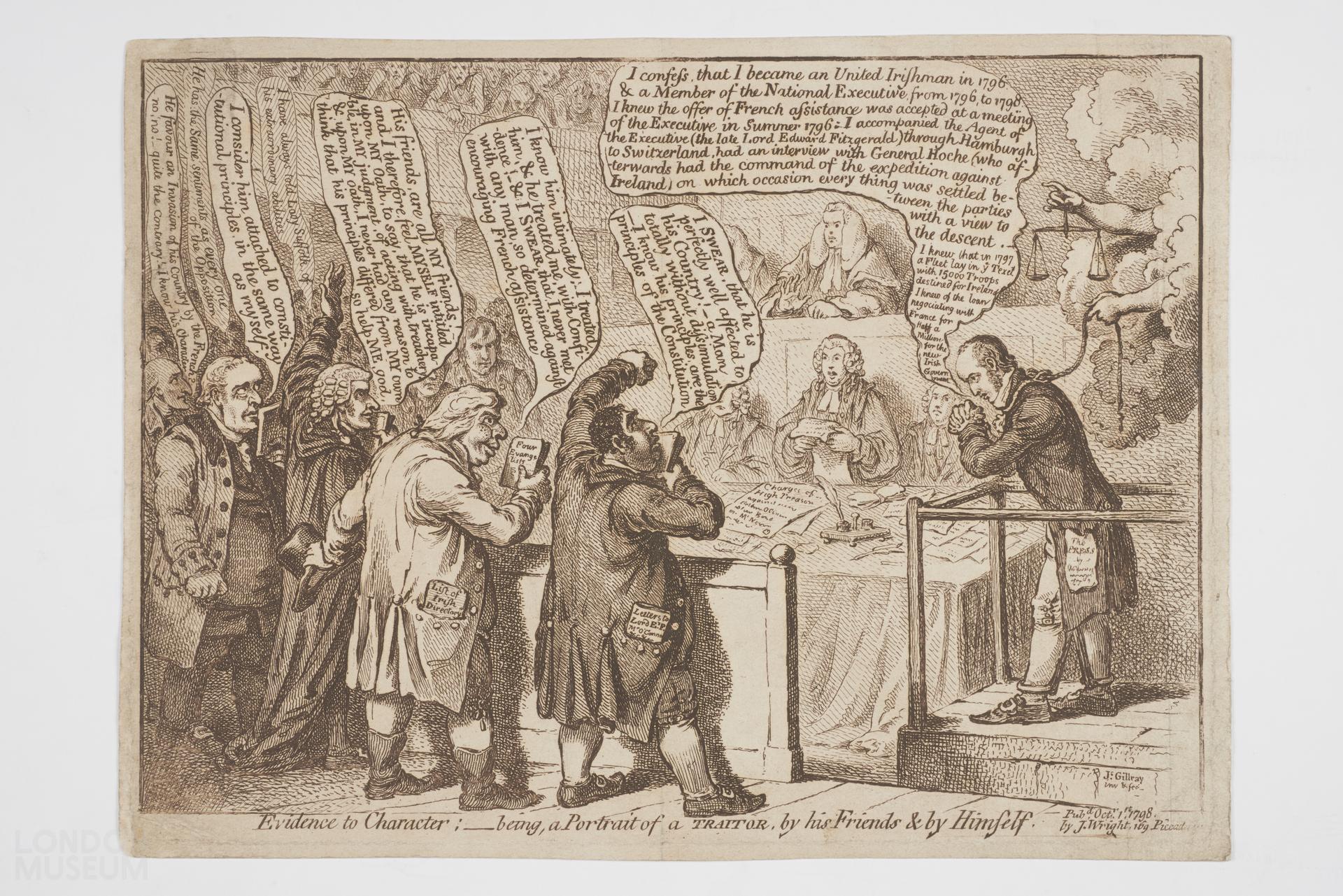 Burlesque of the trial of O'Connor at Maidstone after the Irish rebellion. Fox, Erskine, Sheridan and the Duke of Norfolk appear as witnesses to O'Connor's good character and loyalty even while O'Connor himself confesses detailed involvement in the rebellion. BM catalogue 9245.