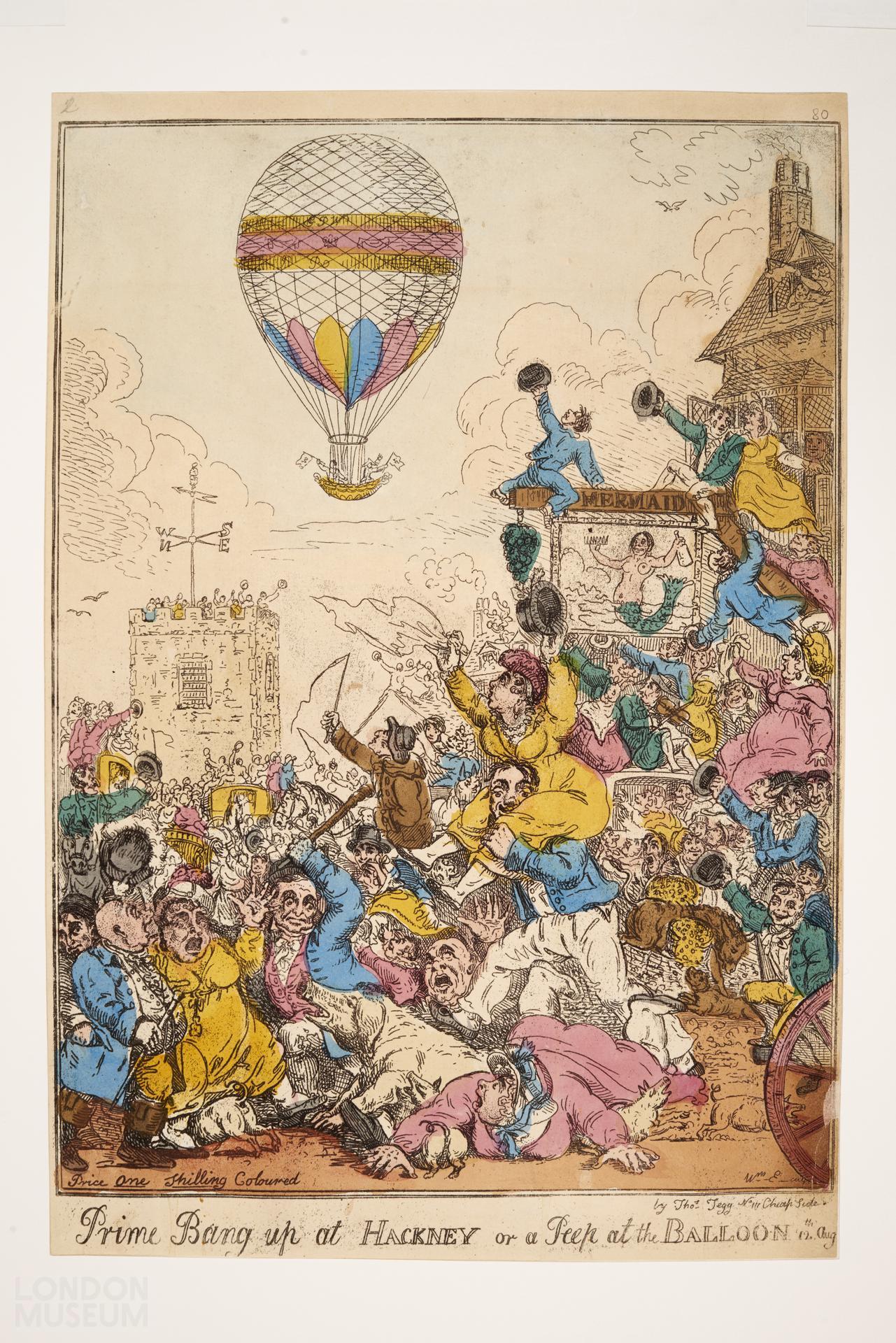 Scenes of wild enthusiasm at the Mermaid Tavern on Monday 12 August 1811 when 3000 spectators reportedly gathered (and more outside) to cheer James Sadler's balloon ascent from the grounds to mark the Regent's birthday. (Sadler was an ingenious inventor and became the first English aeronaut after his balloon ascent from Oxford on 4 October 1784.) In the background is the square tower of Hackney church. The balloon, carrying Lt. Paget RN as a (100 guinea) paying passenger, came down 73 minutes later near Tilbury Fort. A contemporary account is at http://www.printsgeorge.com/Jane_Austen-events.htm#balloon. BM catalogue 11775. SHIC 44743.