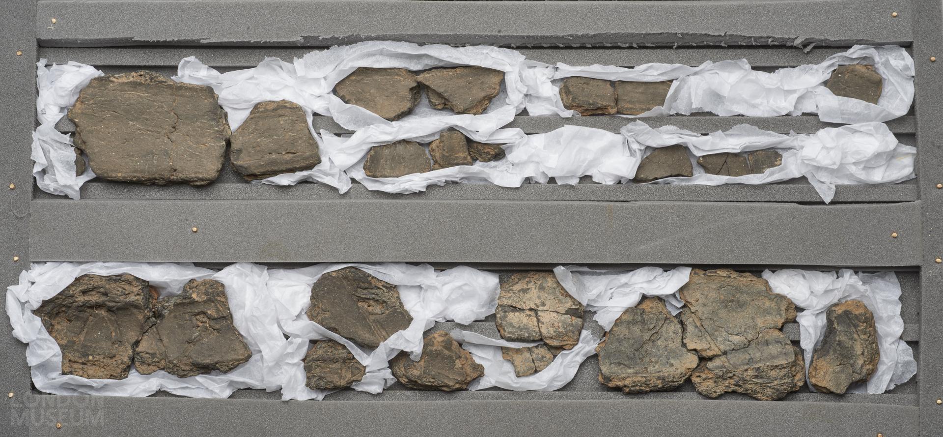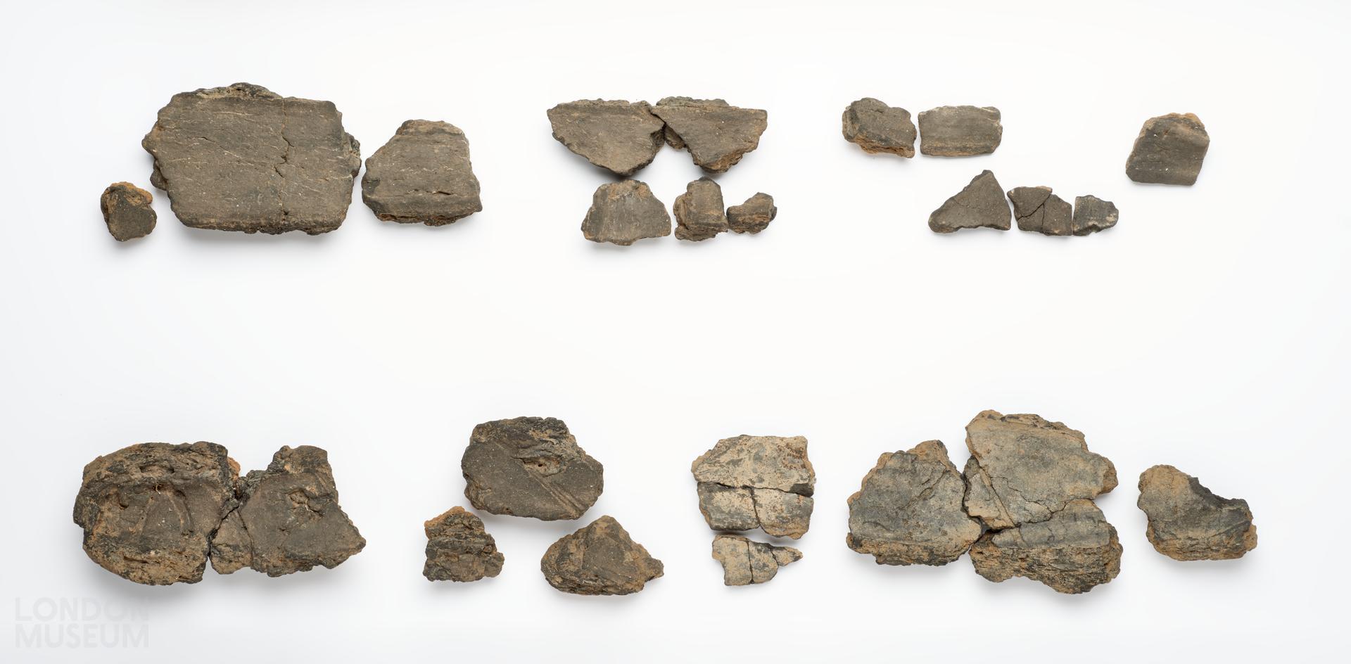 Late Bronze Age fragments of clay mould for the production of a sword with a leaf-shaped blade dating 900 to 700 BCE. The fragments are from the outer wrap of the sword mould. The impressions of the bast used to bind the inner valves is visible.