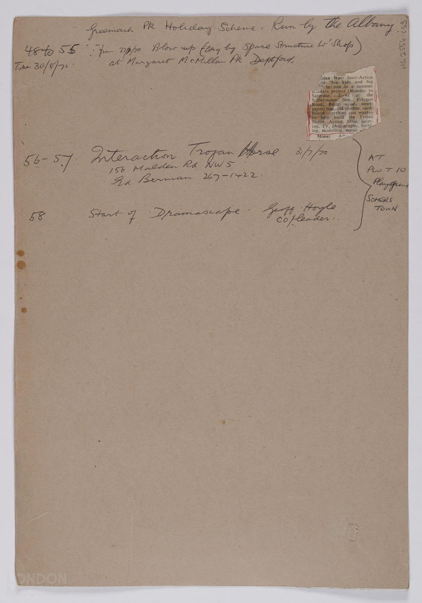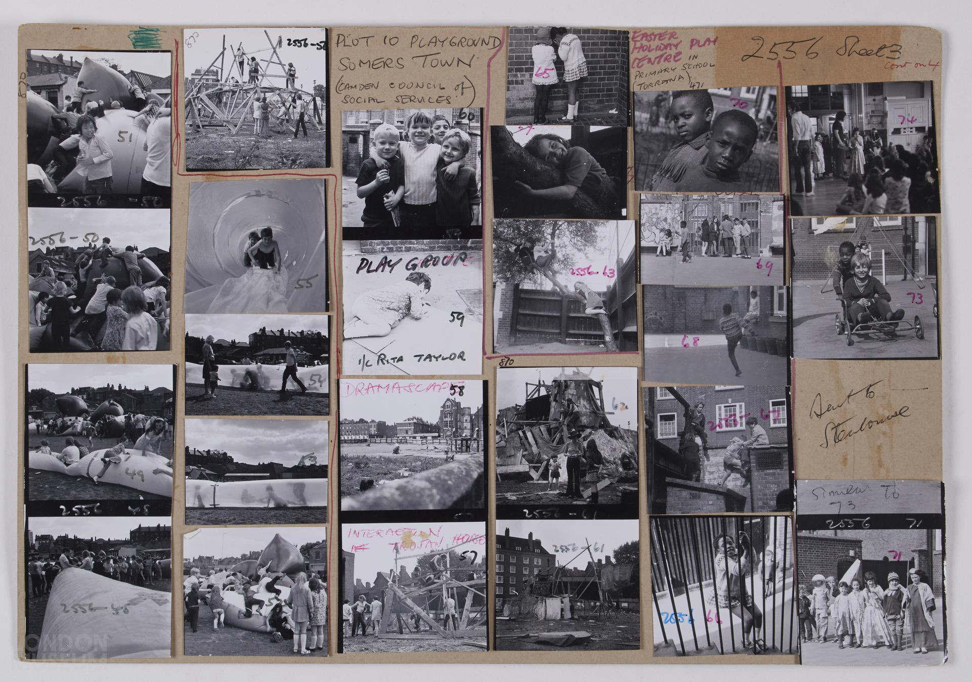 "Motorway Playspace", 1968-1971, 1973, 1976. Images of various children's outdoor activity centres and playgrounds; children's Shanty Town play area; Plot 10 playground, Camden Council of Social Sevices; school play centres during school holidays; Coram Fields; Paddington recreation ground; Winchester Youth Club. Contacts numbered 48-71, 72 is missing, 73-74. Sheet 3 of 5.
