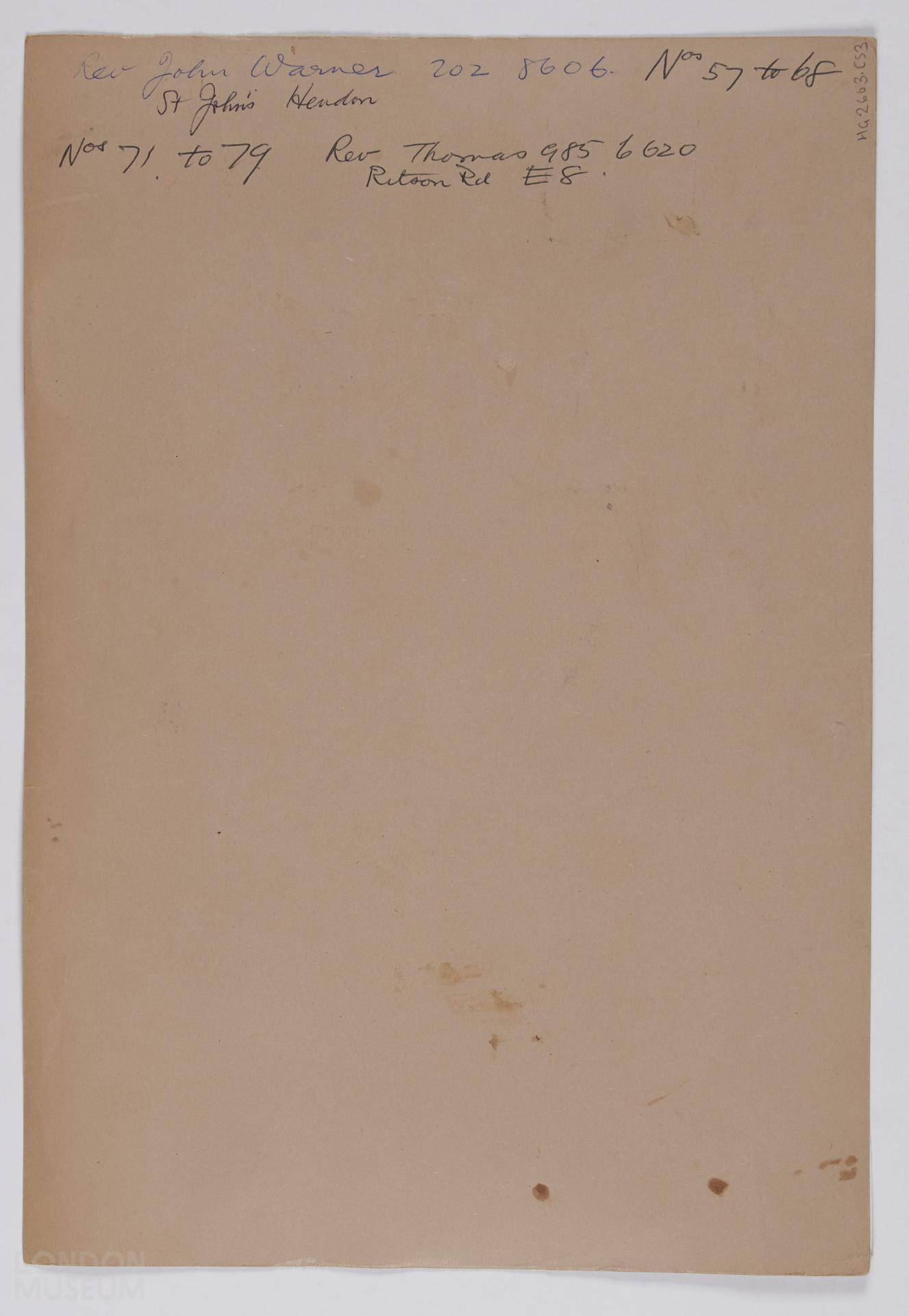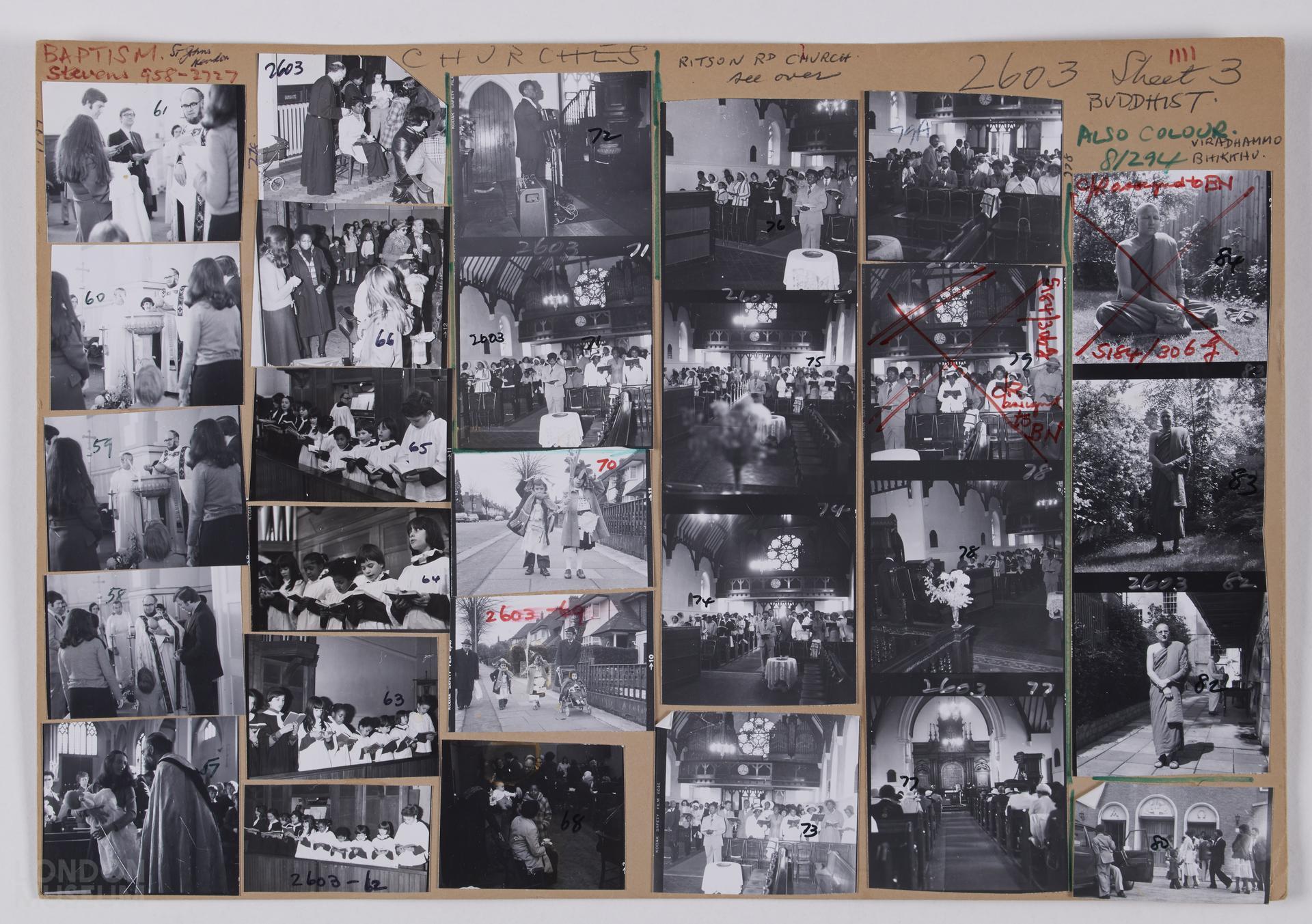 Churches, 1969. Images of views of Catholic church and congregation at Hoop Lane, NW11; Rabbi Rosenfeld at Finchley Synagogue; Hampstead Parish church and churchyard; internal views of St Michael's church, Golders Green, 1973; congregation at Adventist church, Chalk Farm, 1973; unidentified Catholic church; Jews, 1977; baptism at St John's church, 1977; Ritson Road church; Viradhammo Bhikithu, Buddhist, 1978; Highgate Cemetery; Succah, 1982; (some churches not London). Contacts numbered 57-79, 79a, 80, 82-24. Sheet 3 of 4.