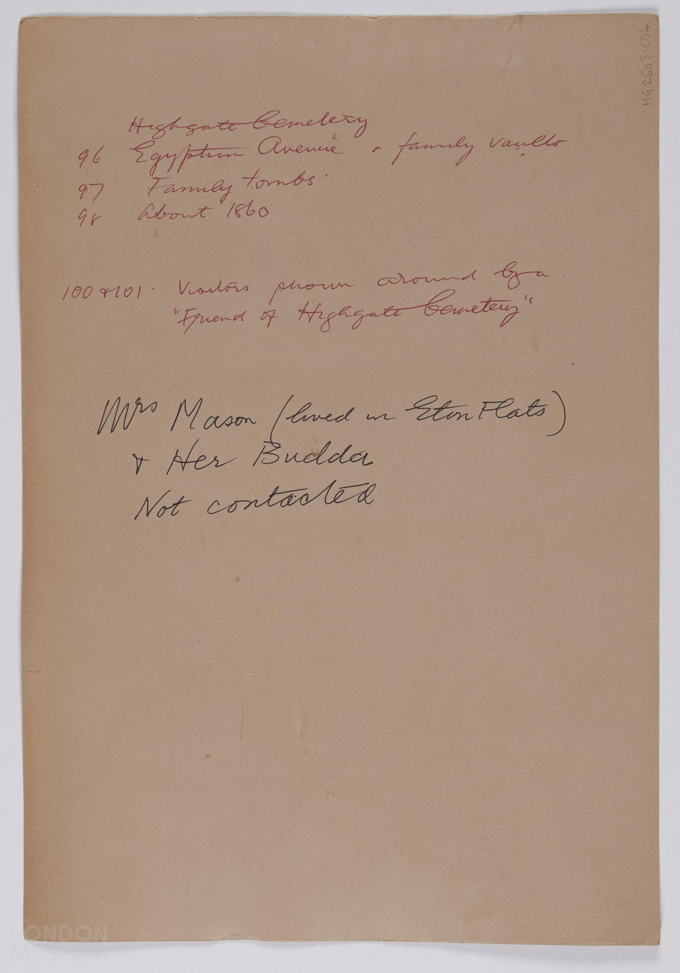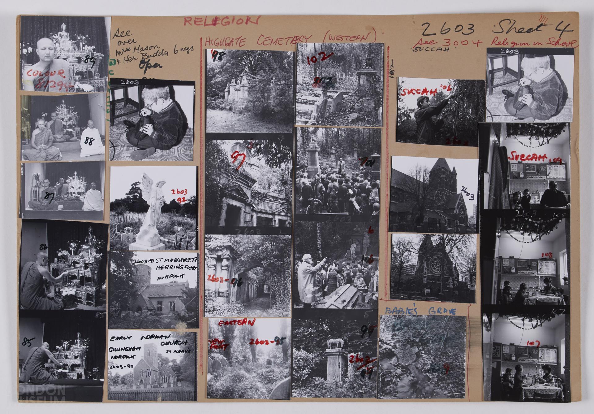 Churches, 1969. Images of views of Catholic church and congregation at Hoop Lane, NW11; Rabbi Rosenfeld at Finchley Synagogue; Hampstead Parish church and churchyard; internal views of St Michael's church, Golders Green, 1973; congregation at Adventist church, Chalk Farm, 1973; unidentified Catholic church; Jews, 1977; baptism at St John's church, 1977; Ritson Road church; Viradhammo Bhikithu, Buddhist, 1978; Highgate Cemetery; Succah, 1982; (some churches not London). Contacts numbered 85-93, 95-110. Sheet 4 of 4.