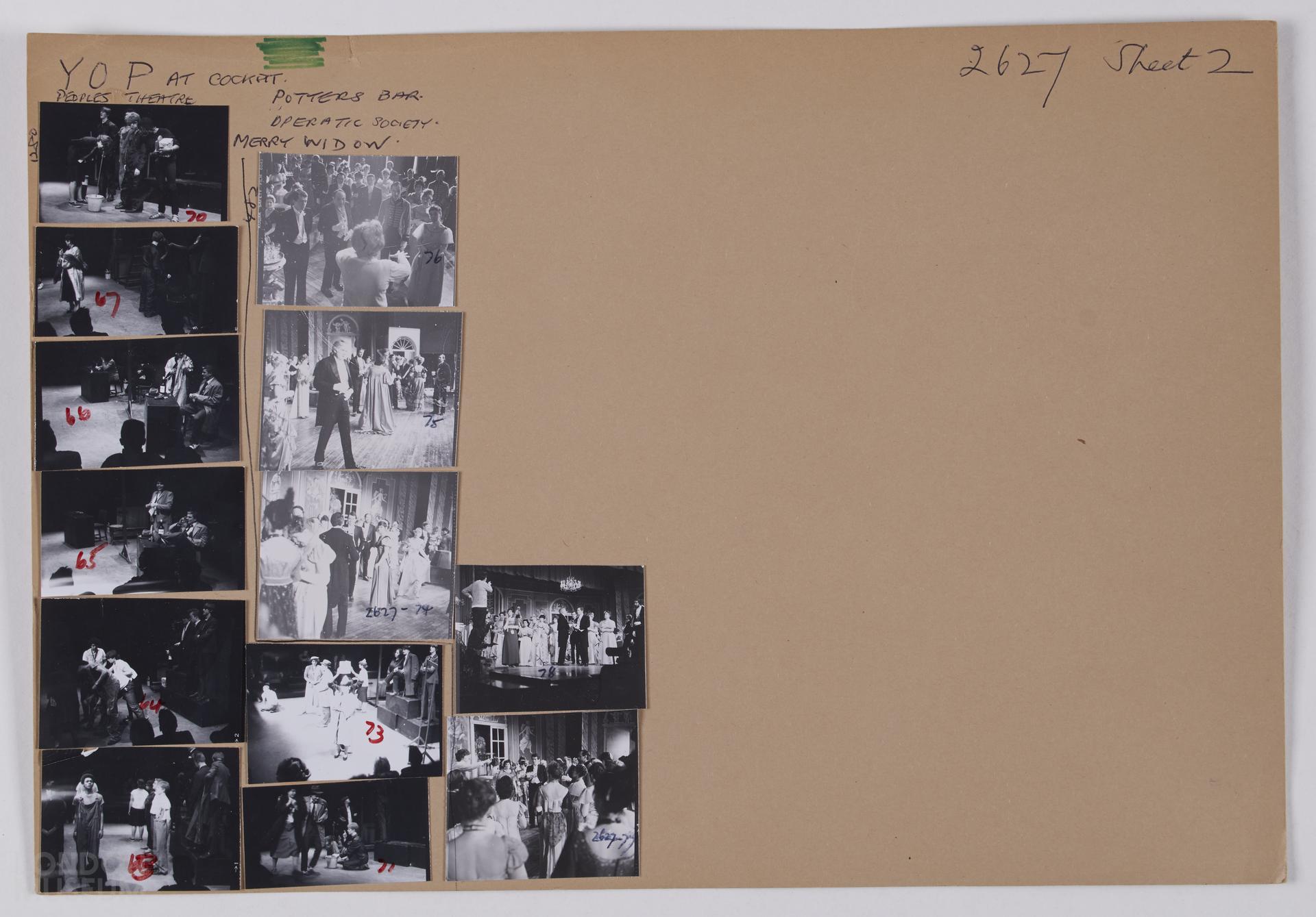 National Youth Theatre, 1974, 1980, 1982. Images of various dramatic performances and rehearsals, including drama course for 14 year olds, jazz dance and costumed performance of Merry Widow at Potters Bar Operatic Society. Cockpit; Jennie Lee; Haverstock School; Collegiate Theatre. Contacts numbered 63-67, 70-71, 73-78. Sheet 2 of 2.