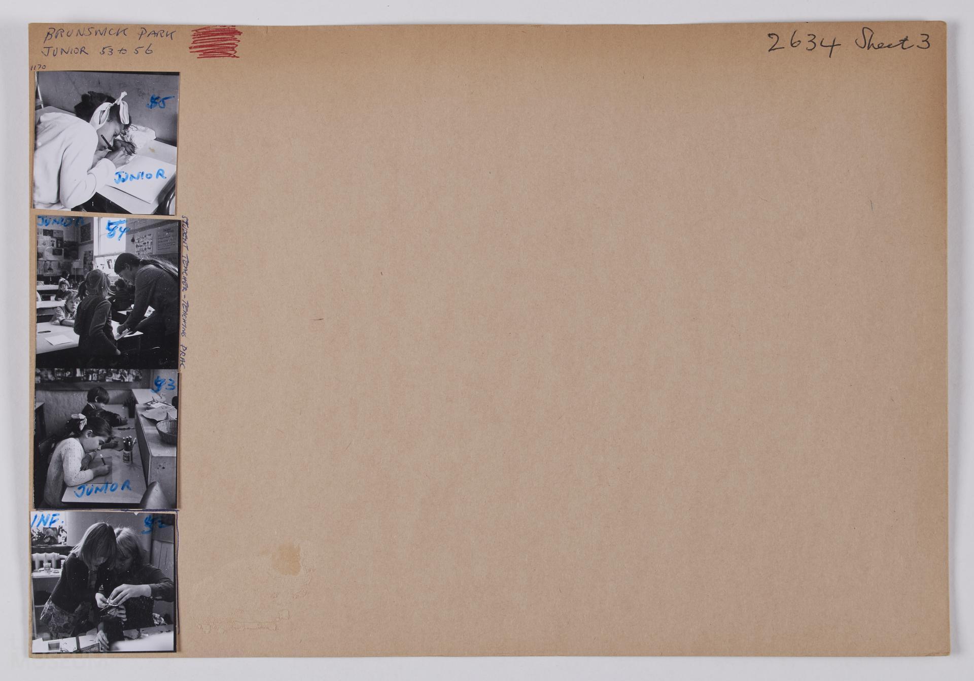 Brunswick Park Infants (name of school not to be given), 1970. Images of teachers, pupils, classroom activities, mealtimes. Contacts numbered 52-55. Sheet 3 of 3.