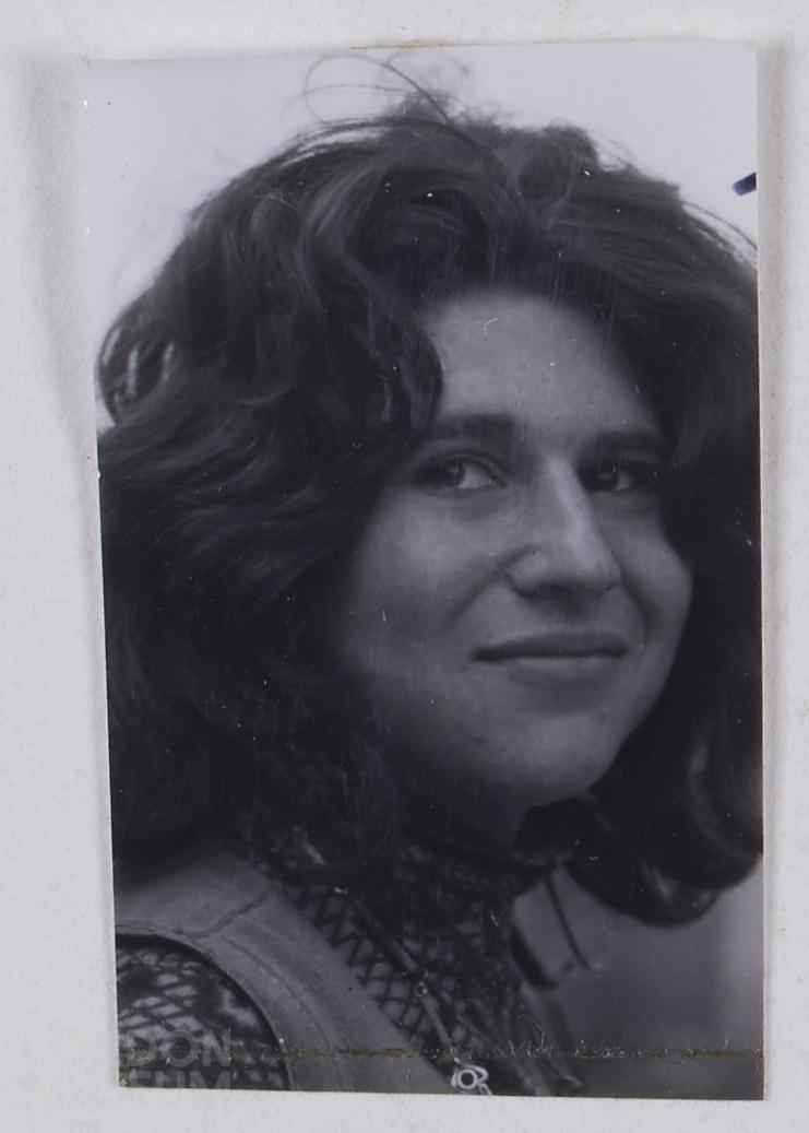 Photograph detached from contact sheet with an image of the head and shoulders of a woman who is looking at the camera.