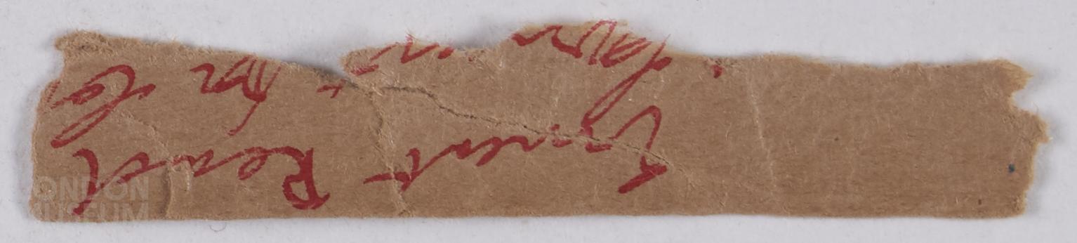 Brown card cutting from the edge of a card contact sheet. With illegible writing handwritten in red ink.