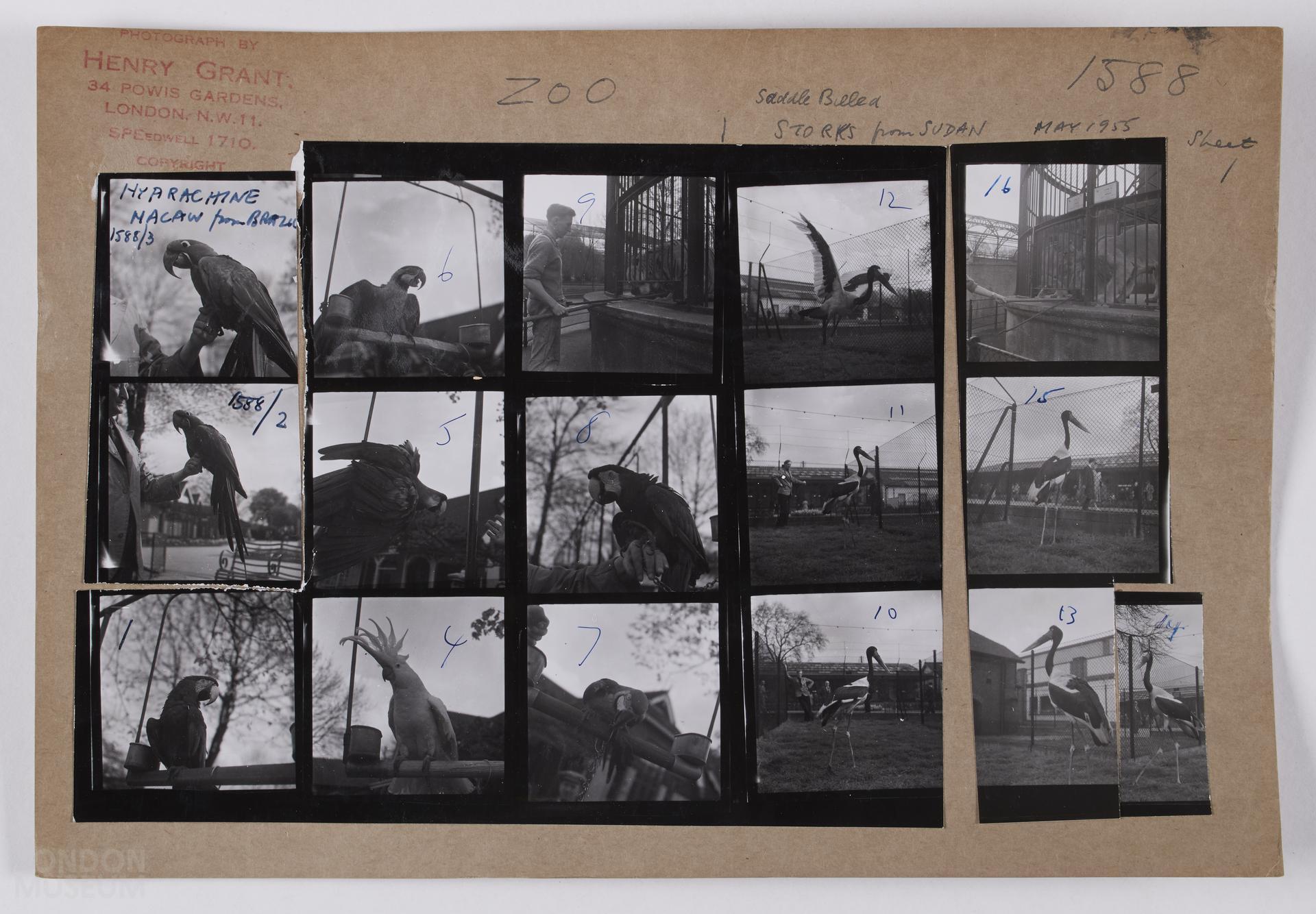 Zoo, -/5/1955: various at animals at London Zoo including, storks from Sudan, parrots and a zoo keeper feeding lions and a tiger. 6x6 cm (1-16). One of three sheets.
