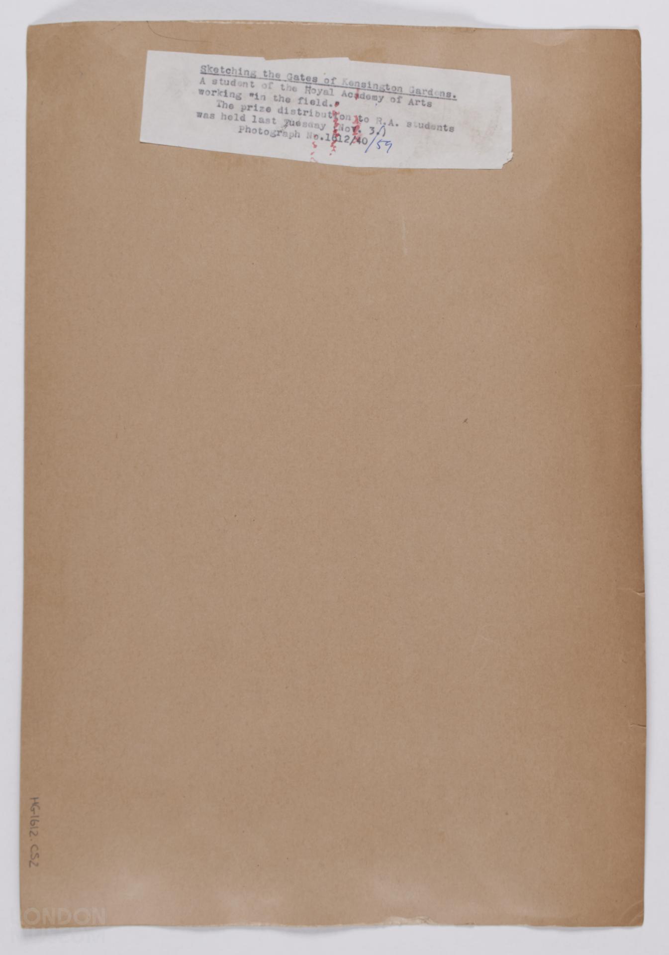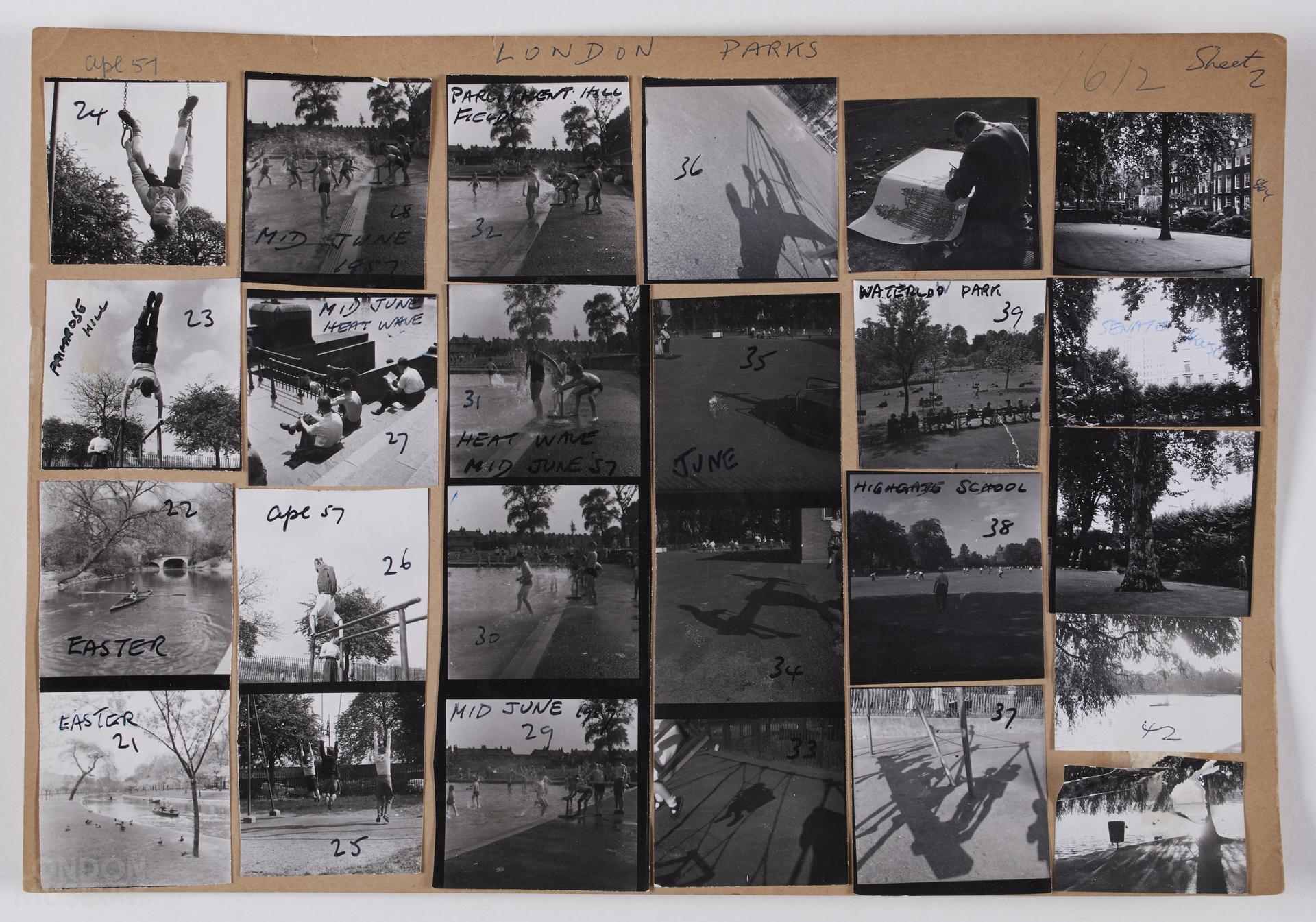 London Parks, various 1957: Primrose Hill, Parliament Hill Fields, Waterlow Park, Highgate School, Senate House. Typed caption note on the reverse reads: Sketching the gates of Kensington Gardens. A student of the Royal Academy of Arts working in the field. The prize distribution to R.A. students was held last Tuesday Nov. 3. Photograph No.1612/40/59. 6x6 cm (21-39, 42, five are not numbered). Two of three sheets.