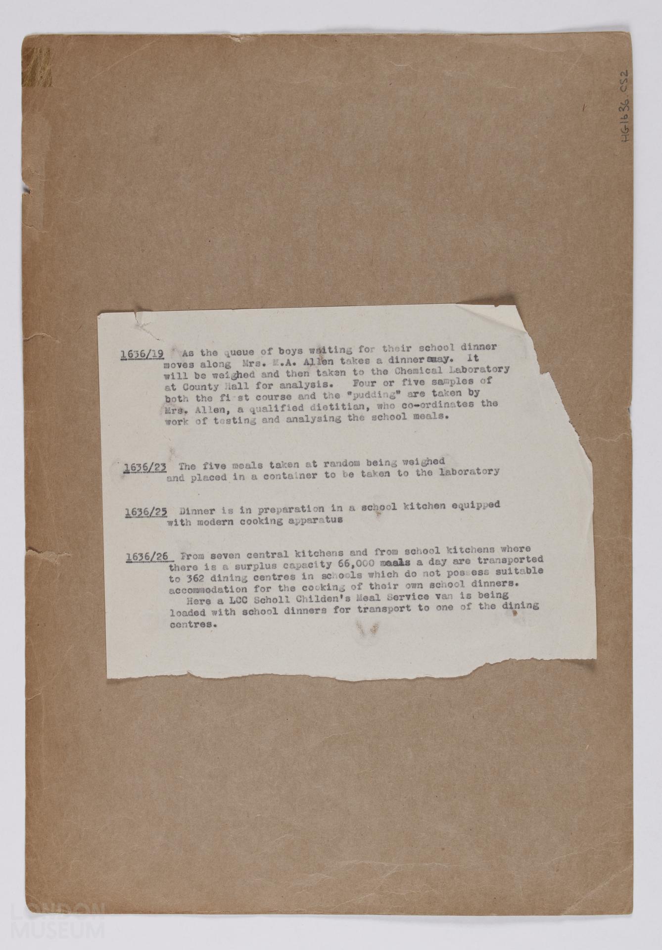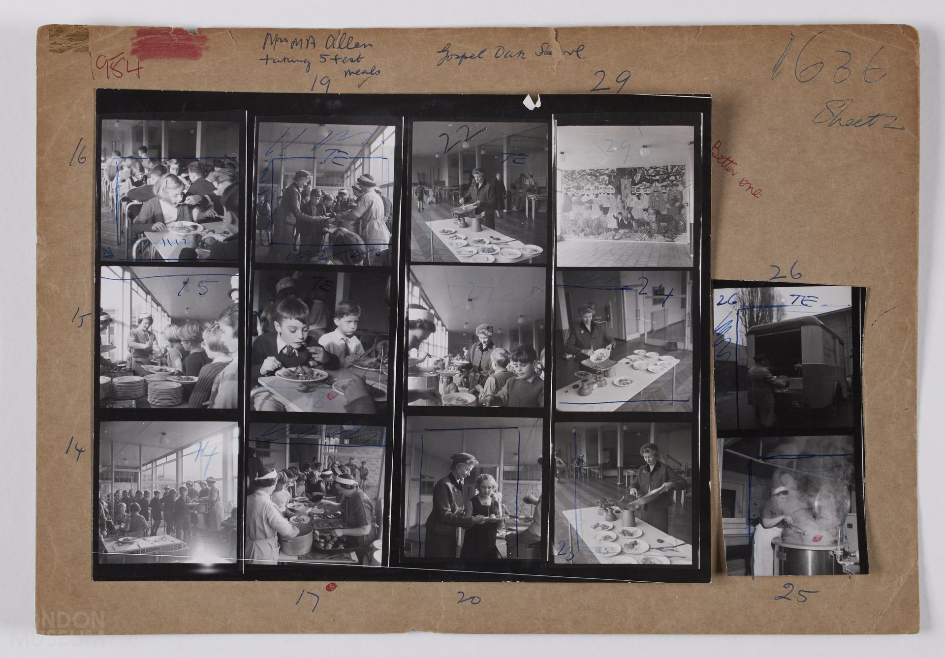 Testing School Meals, 1954: Mrs. M. A. Allen (dietitian) testing meals at the Gospel Oak School, images include the cooking and delivering of meals and children eating. 6x6 cm (14-26, 29). There are detailed notes on the reverse. Two of two sheets.