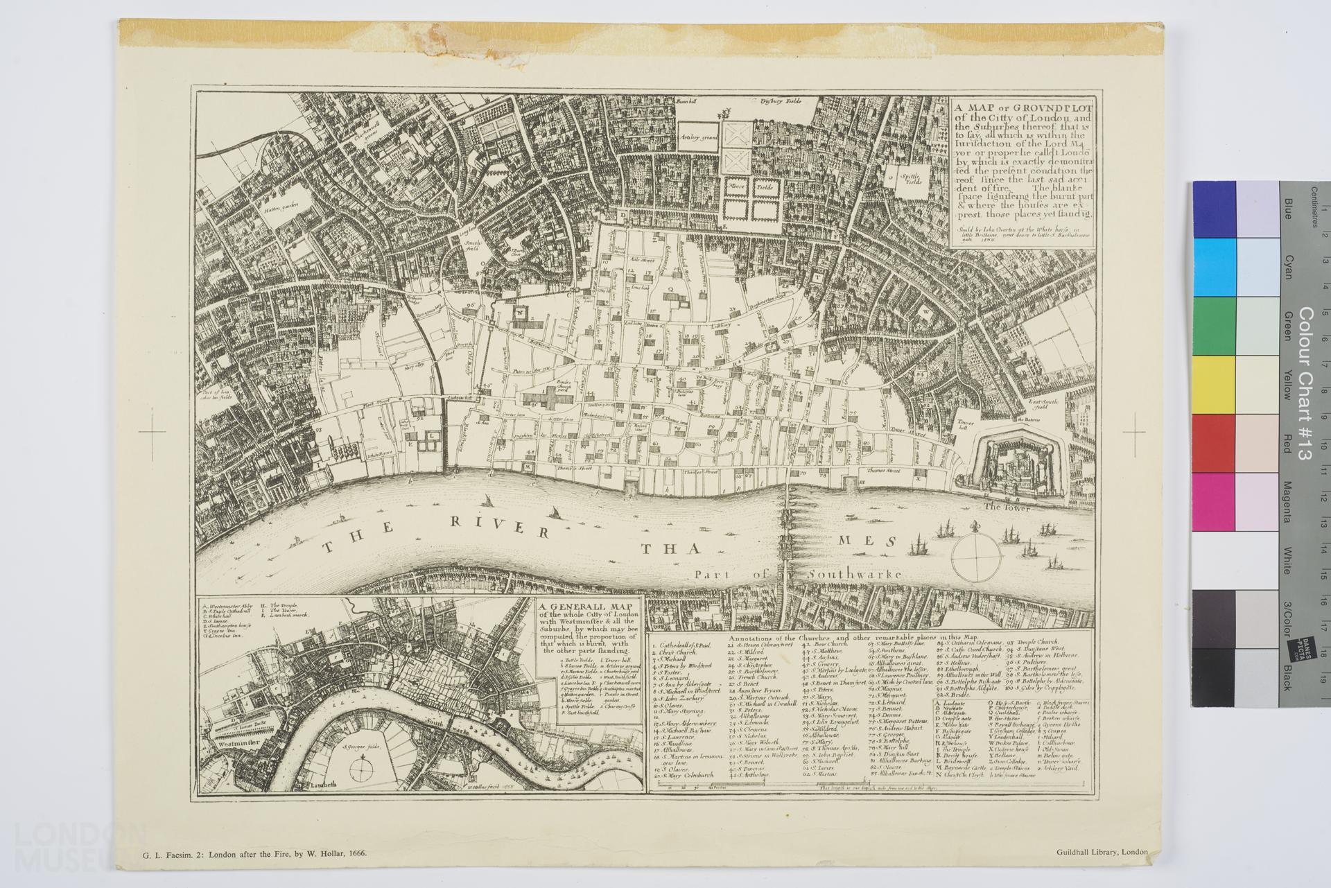 Facsimile map titled 'A map or groundplot of the citty of London and the suburbes thereof that is to say all which is within the iurisdiction of the Lord Mayor'. Text at the bottom of the sheet reads 'G.L. Facim [facsimilie]: London after the Fire by W. Hollar, 1666. Guildhall Library London.'