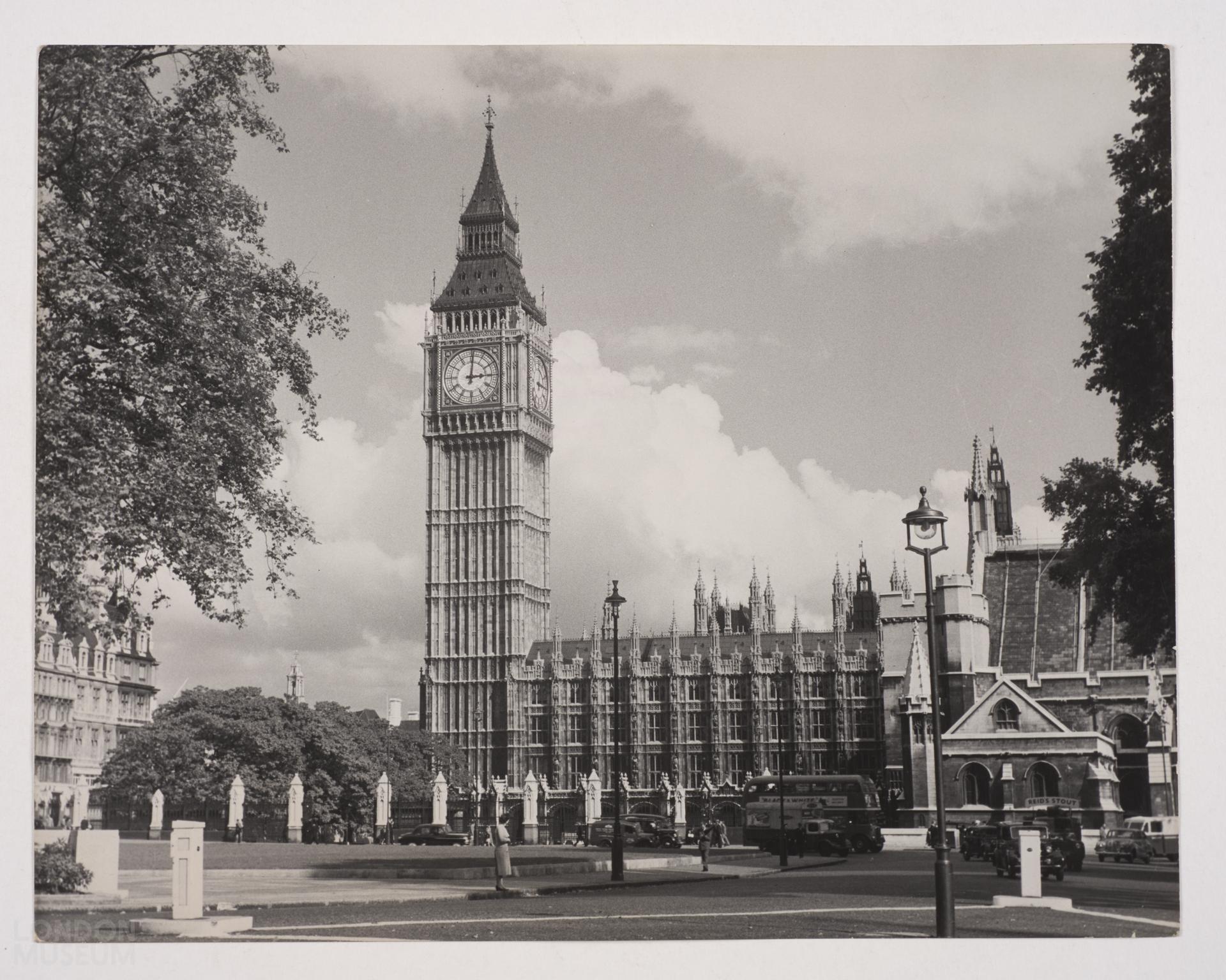 Gelatin silver print, part of the Henry Grant photographs collection focusing on London. The image shows the Houses of Parliament with Big Ben seen across Parliament Square.