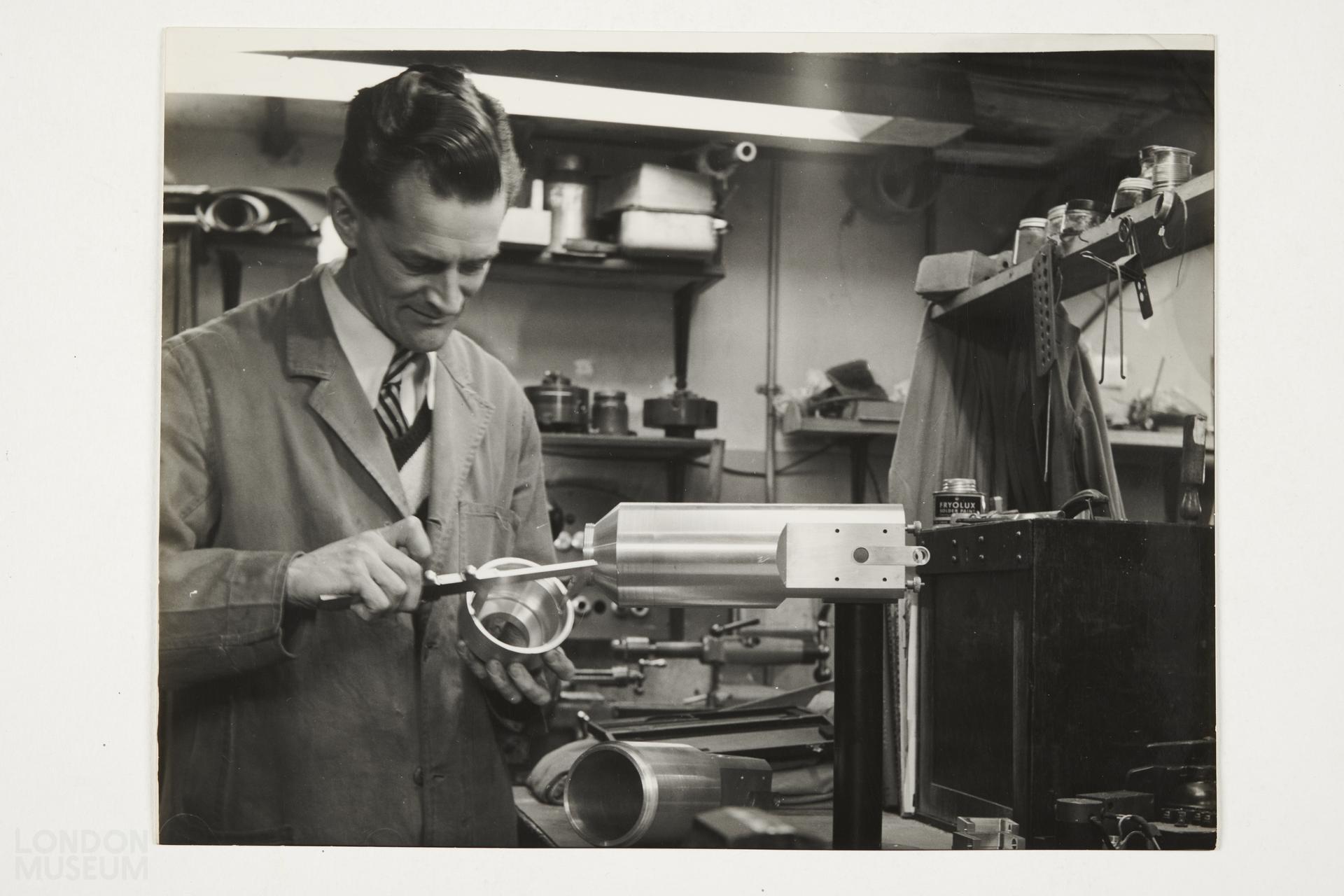 Gelatin silver print, part of the Henry Grant photographs collection. From a group of images of crystallography at Birkbeck, circa 1954. The image shows an individual using calipers to measure a piece of scientific equipment in a laboratory.