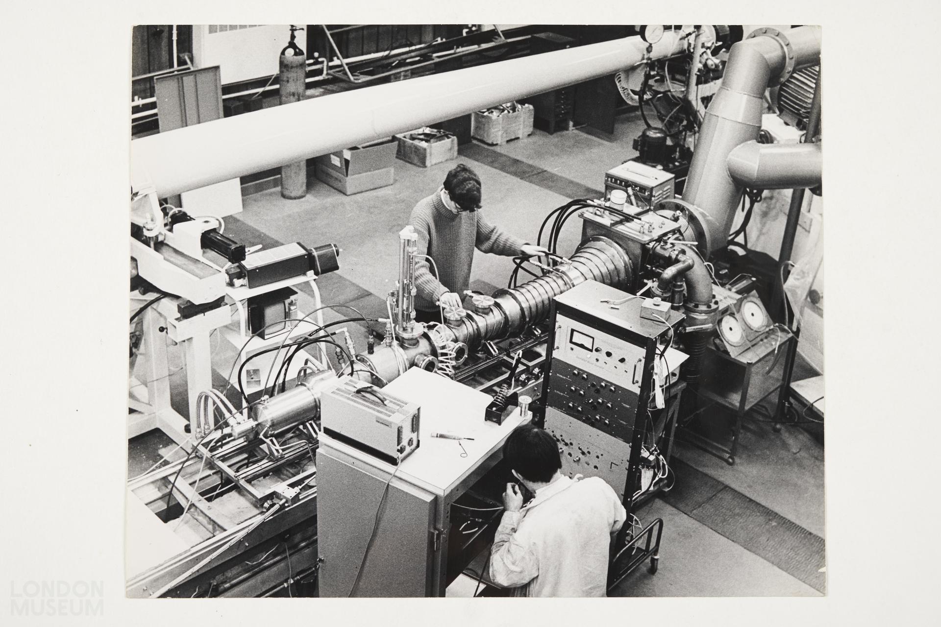 Gelatin silver print, part of the Henry Grant photographs collection. From a group of images of Imperial College, 1969. The image shows two individuals working on an electronic machine that takes up the large room. The handwritten caption on the reverse reads 'Imperial College of Science, London University. Dept of Aeronautical Engineering. One of a set on Imperial College.'
