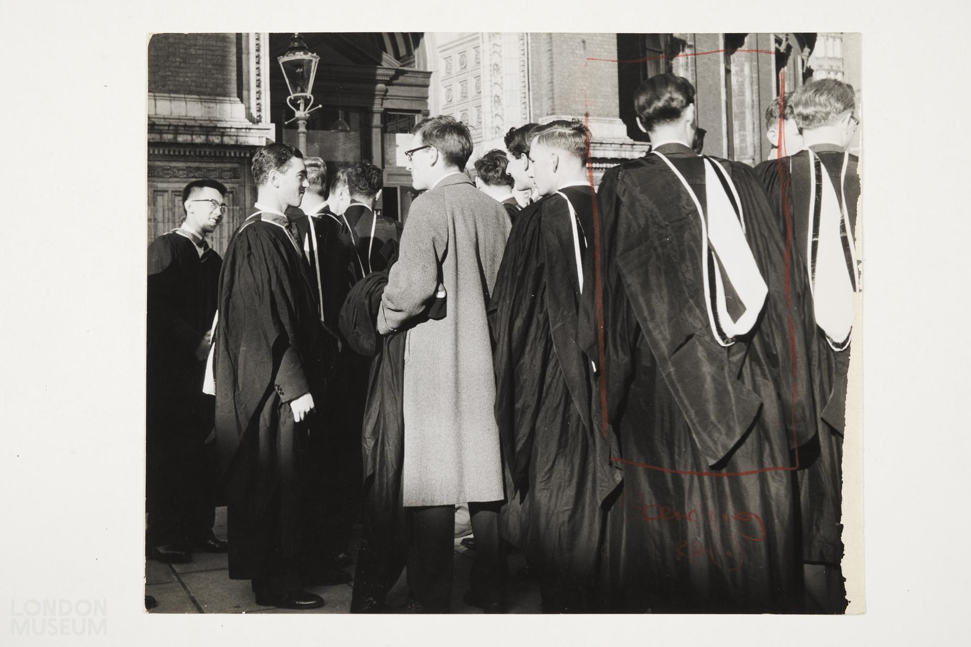 Gelatin silver print, part of the Henry Grant photographs collection. From a group of images of Imperial College of Science and Technology Commemoration Day at the Royal Albert Hall, 22/10/1959. The image shows individuals, wearing academic gowns, standing in a queue outside a building. The handwritten caption on the reverse reads 'London University. Imperial College graduates.'