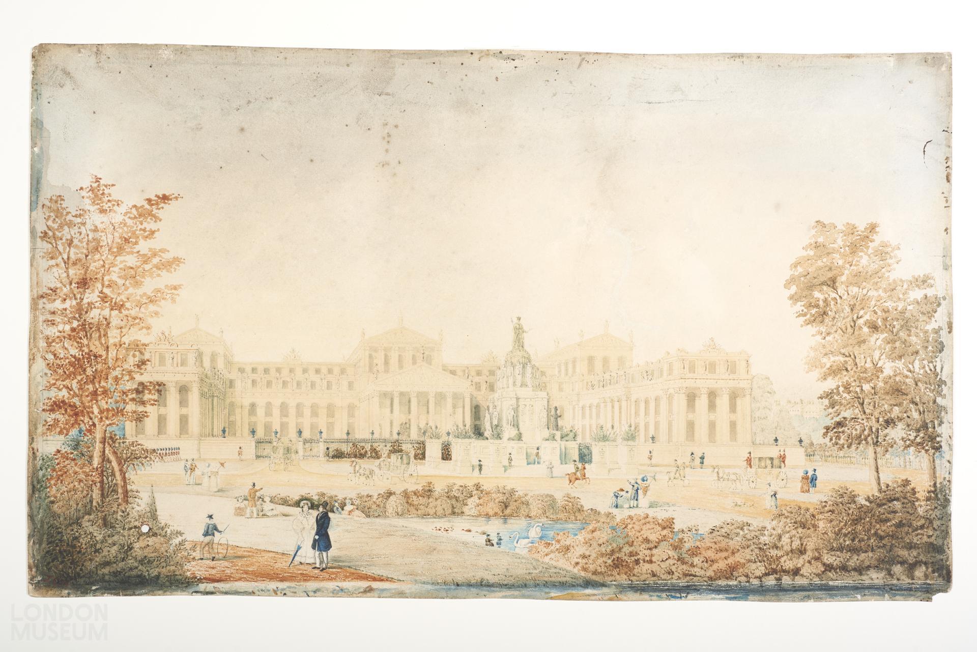 Buckingham Palace - apparently a rejected design for its transformation at the time Nash was preparing his plans to transform the old Queen's House (which went to the Commons in June 1825). The initials J C H at the bottom left but evidence for the date 1824 (on card index) is not on the drawing. The design is more elaborate than Nash's (see A8087) with an extra storey, different shape windows, more decoration, a statue of the king on a monument roughly where the Marble Arch was later placed, etc. It may be a rejected plan by Nash or someone else for complete rebuilding of the palace, such as was briefly considered at the time. Negative no. 7740.