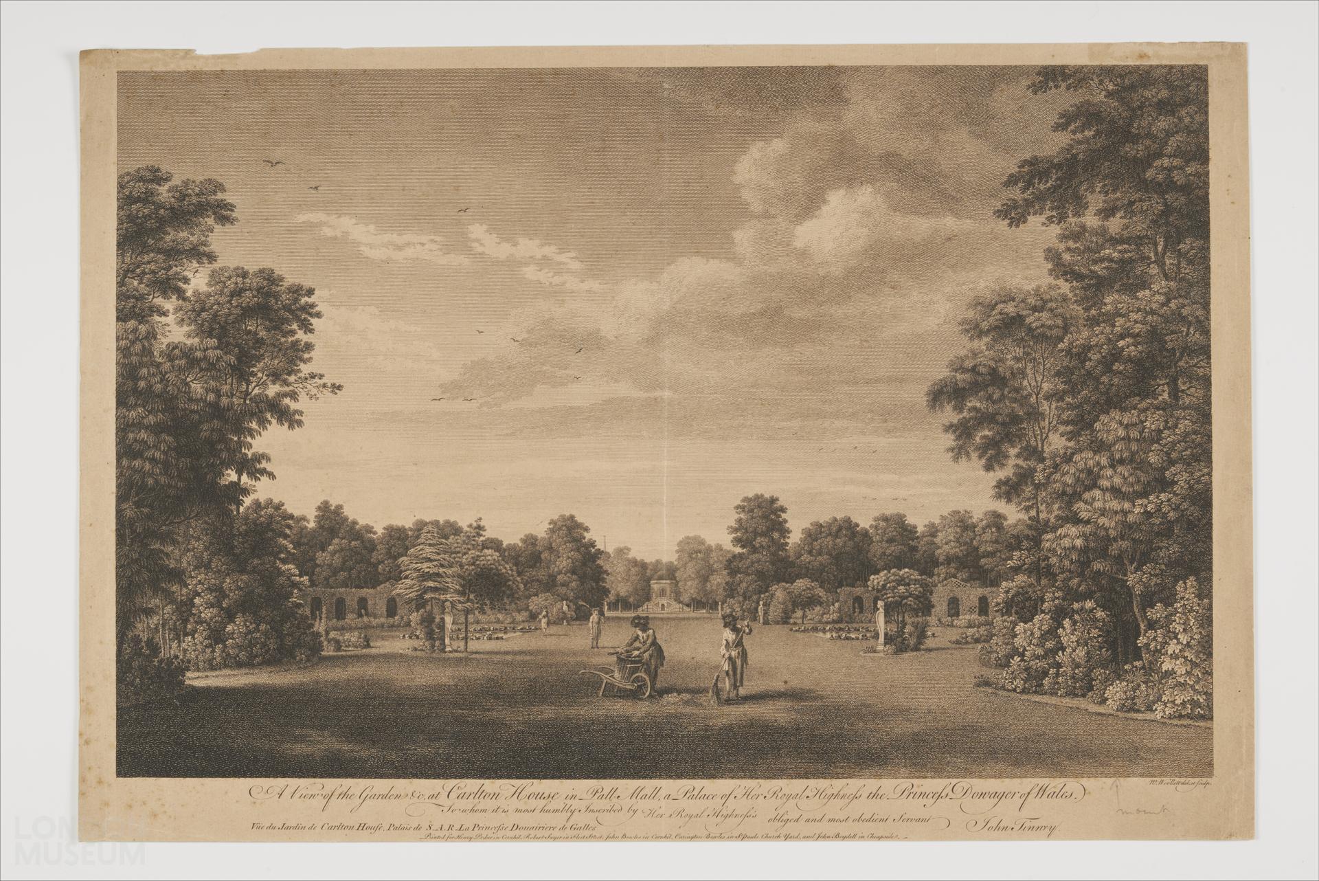 'A View of the Gardens at Carlton House in Pall Mall, a Palace of Her Royal Highness the Princess Dowager of Wales.', by Woollett, c. 1760. Gardeners sweep and pile leaves in the foreground. A man with a scythe stands before a pond, a small temple and statuary in the background. The gardens of Carlton House were laid out for the Prince of Wales by William Kent in the 1730s in the new informal style. This was one of a number of prints of aristocratic gardens published by Tinney from the 1740s onwards, designed to appeal not just to their owners but the middle classes who visited them - an increasingly large market.