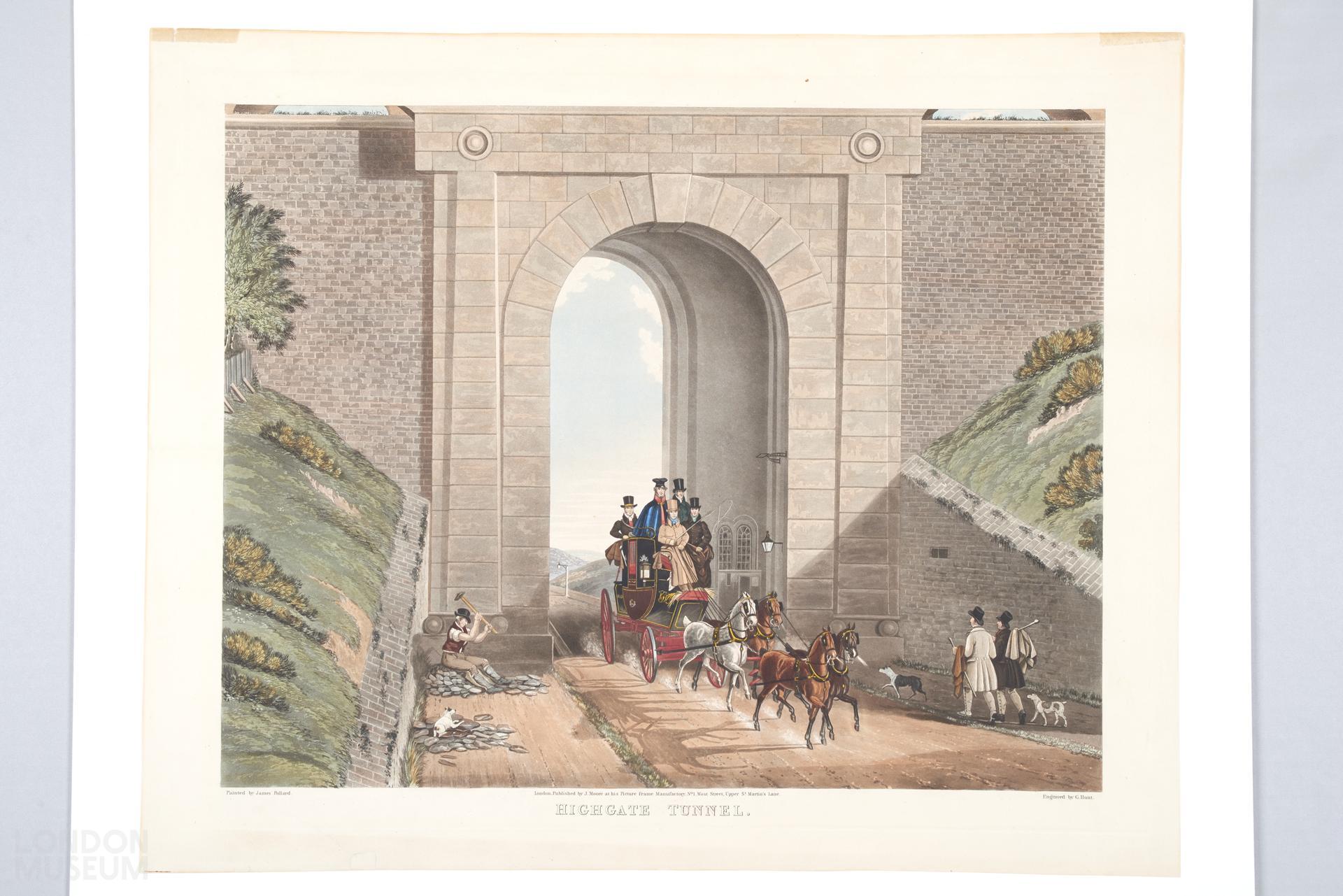 Highgate Archway from the north, with a coach and four coming through, a workman seated at left breaking stones, and two men with dogs walking down towards the archway.