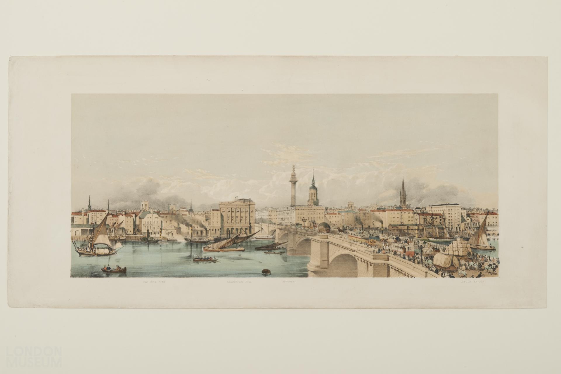One of ten lithographs making up a panorama of the north bank of the river from the Houses of Parliament to the Tower of London (58.22/55 - 58.22/64). This view is from London Bridge and includes the Monument, Fishmongers Hall, Old Swan Pier, St. Magnus Church.