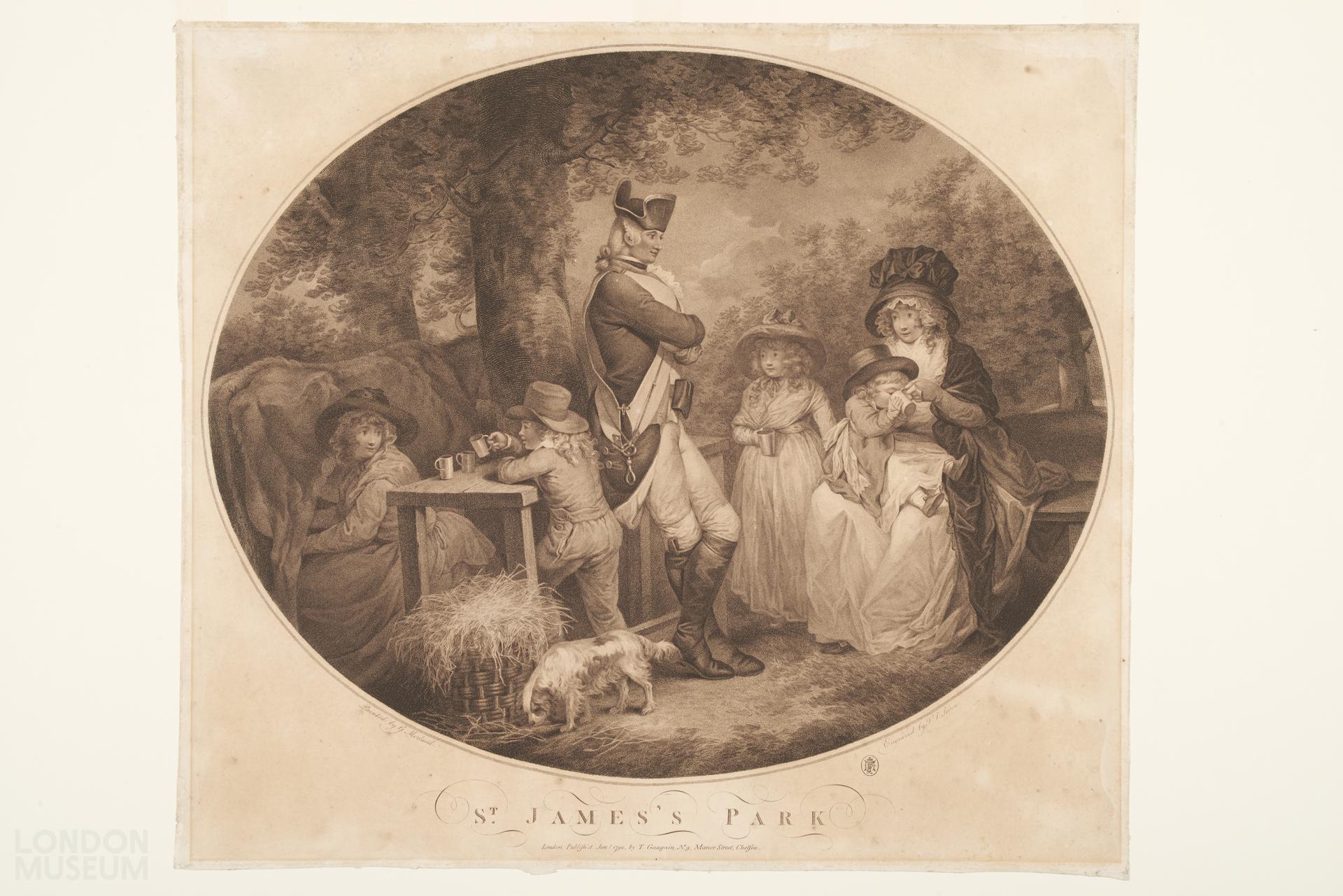 Oval print of a bucolic scene in St James's Park with a fashionable dressed family drinking freshly expressed cow's milk from mug-like tankards.