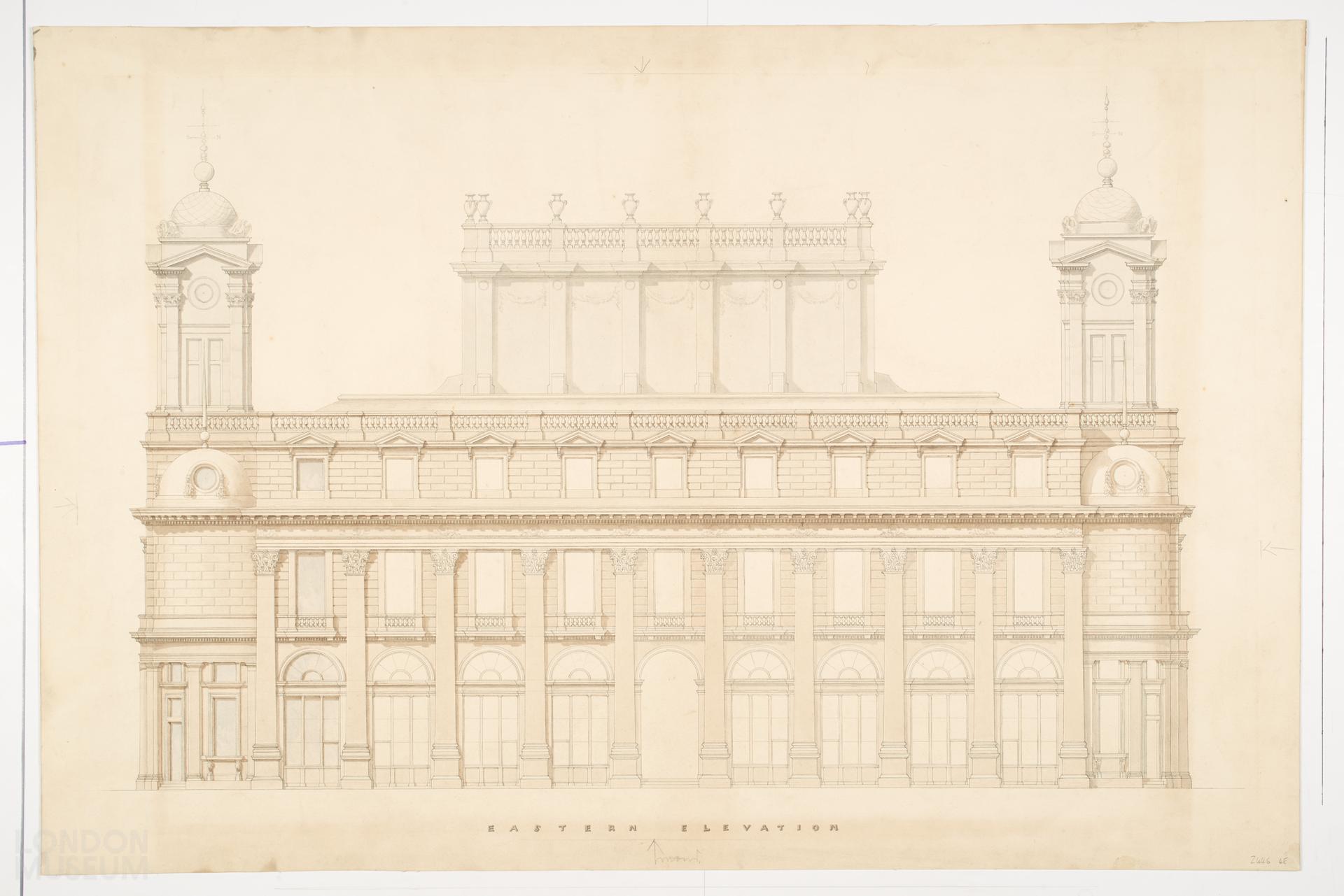 Eastern elevation of unsuccessful design for the rebuilding of the Royal Exchange. Sent in in the name only of Richardson, a former pupil of Cockerell, but the latter was responsible for the design. Neg. No. 7955. Cf. Z6804.