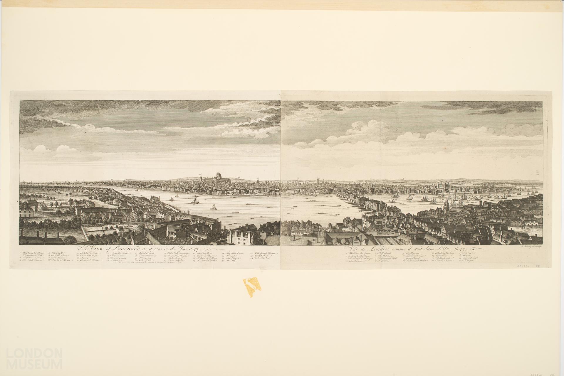 Panorama: panoramic view of London from Westminster Abbey to Tower of London in 1647, on two sheets (glued together), each with a key. Parallel titles in French also.
