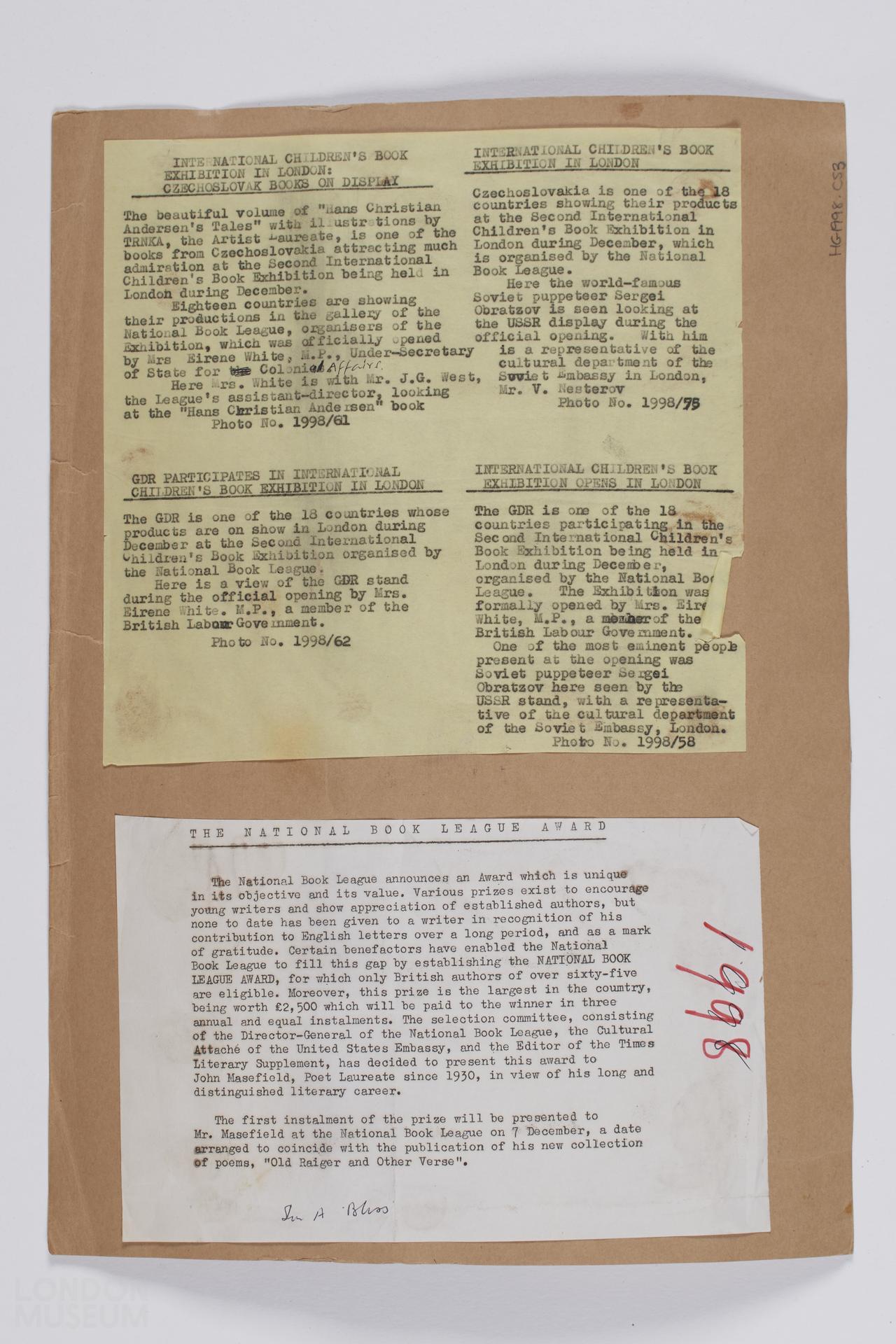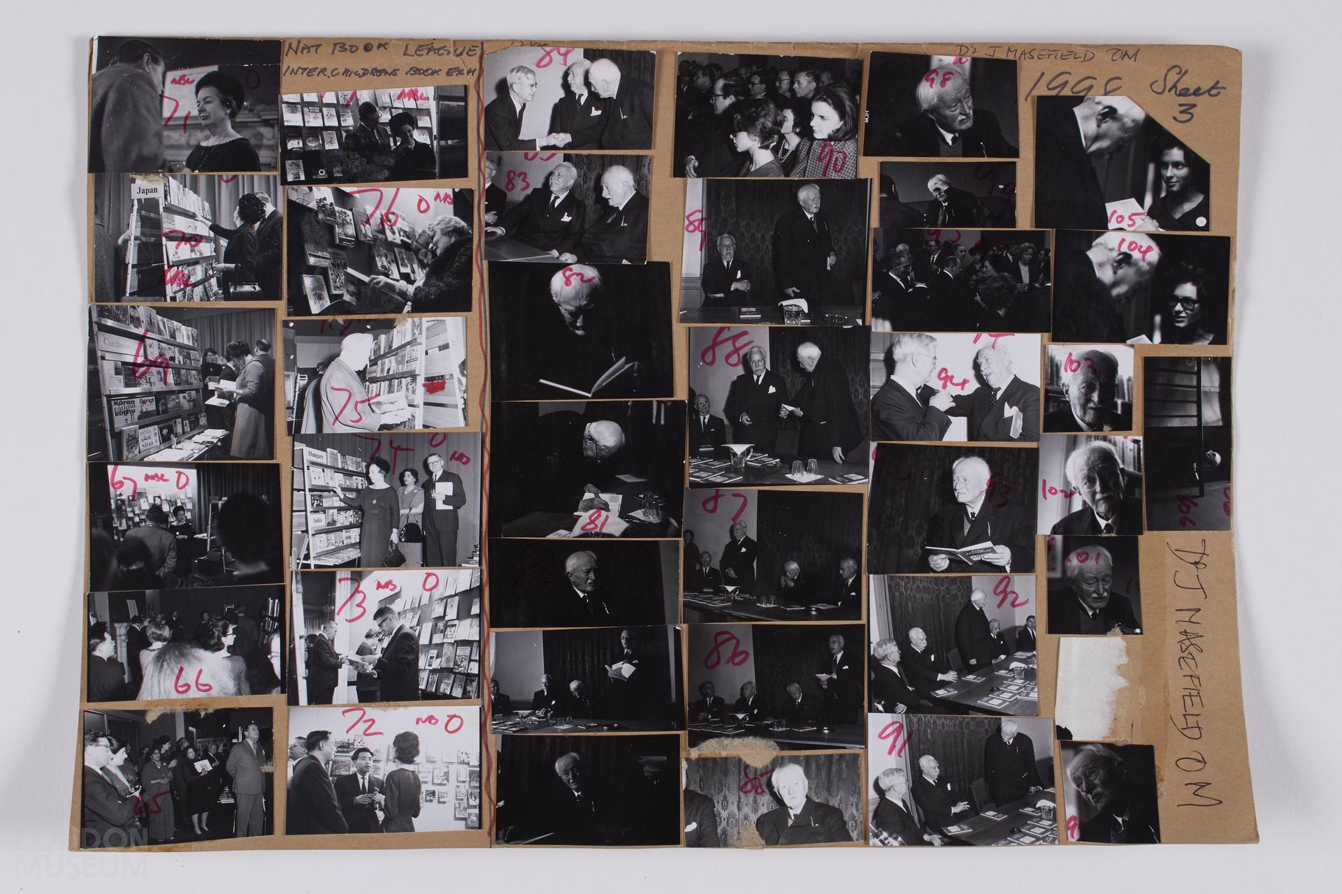 National Book League - International Children's Book Exhibition and images of Dr J Maselfield OM recieving a prize. 6x6cm (marked 65-67, 69-77, 81-95, 98, 99, 99, 101-106, one is missing and three are not numbered). Adhered on the reverse are white and yellow paper sheets with descriptions of the photographs. One of three sheets.