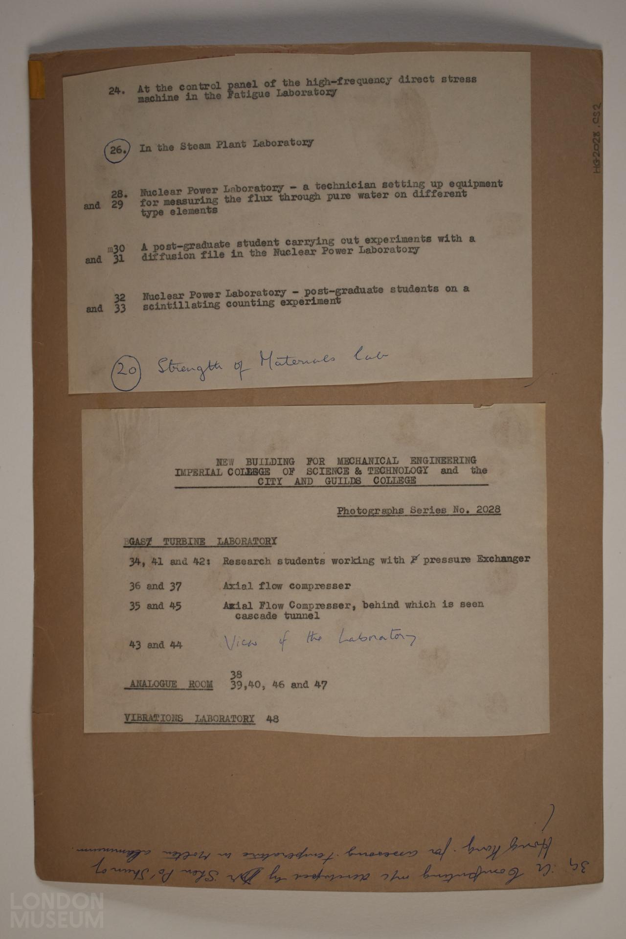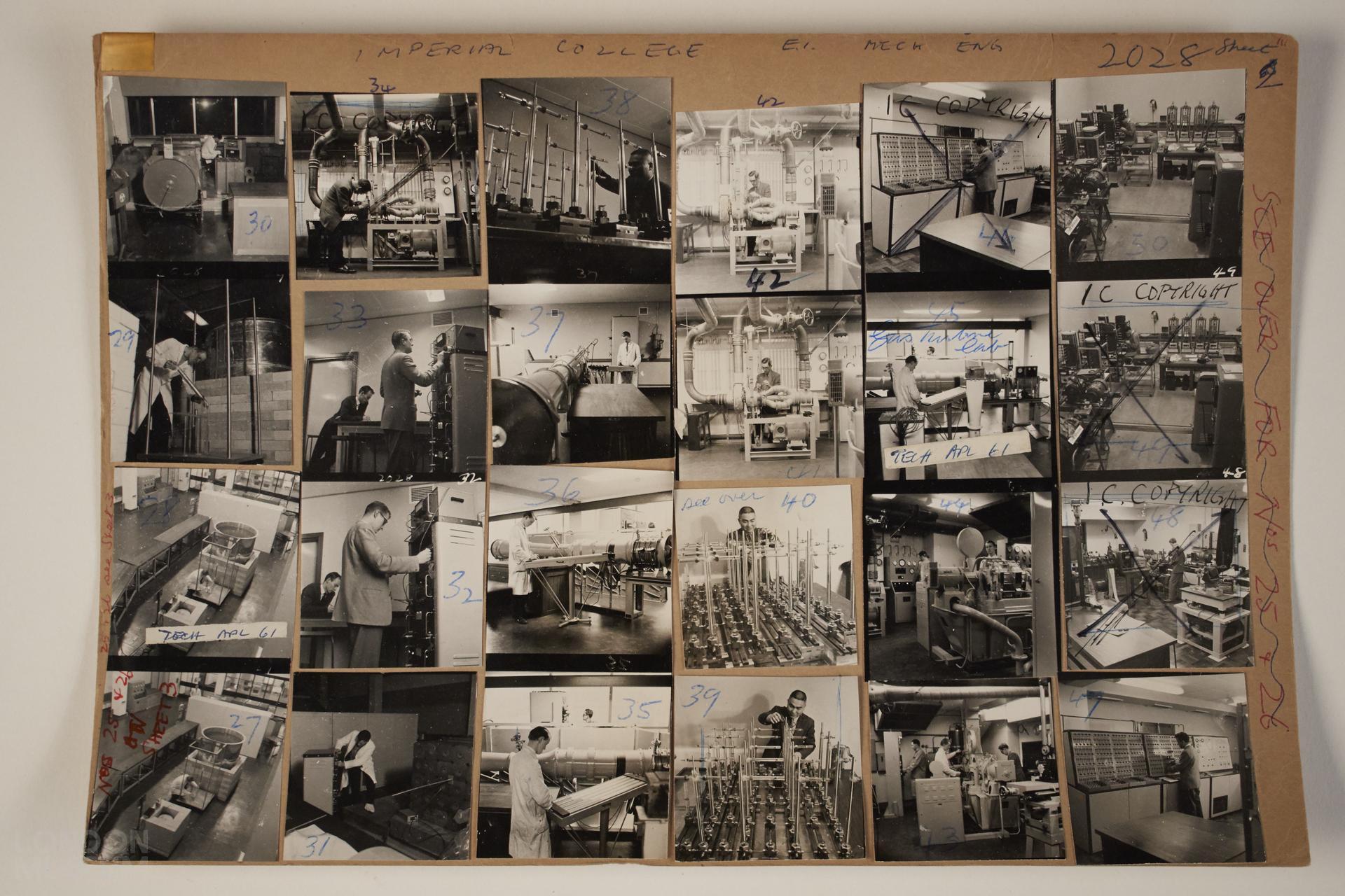 Imperial College, Mechanical Engineering in new building, -/4/61, 26/5/61: images of the machinery and operators in the new building. 6x6 cm (marked 27-50). Adhered on the reverse are white paper sheets with descriptions of the photographs. One of three sheets.