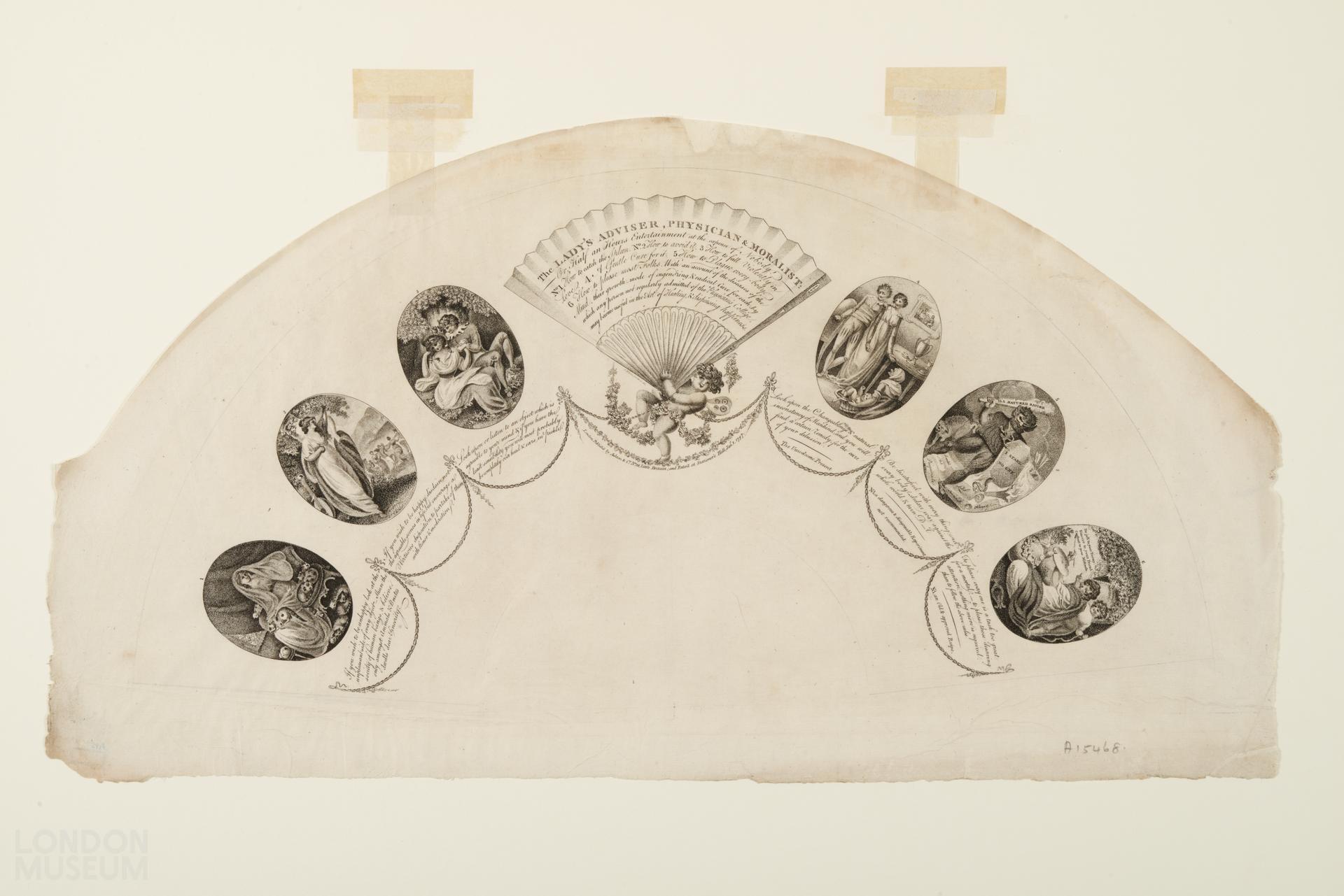 Fan print. Six medallion illustrations with mock advice. Cream paper printed in black with centre a cherub holding a fan on which is printed: "The Lady's Adviser, Physician and Moralist" - "or, Half an Hour's Entertainment at the expense of Nobody!", listing six points of advice; on either side three oval scenes each depicting one point of advice listed on fan, with explanatory text beneath. At bottom centre: "London, published by Ashton & Co. No 28 Little Britain", "Enter'd at Stationer's Hall, Jany 1, 1797". Schreiber No. 121, p. 84.