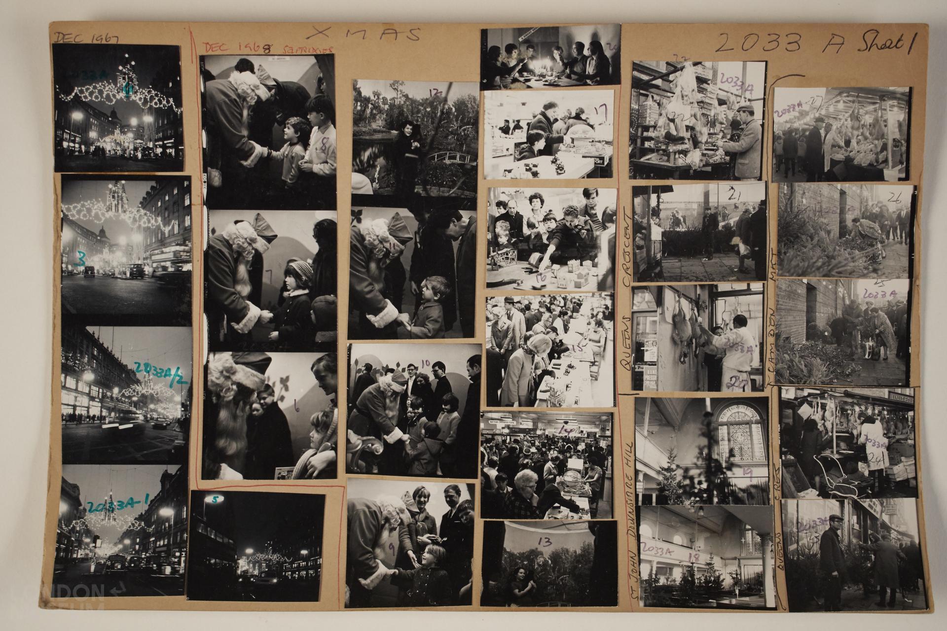 Xmas around London 1967,1968: images of Christmas lights, Father Christmas at Selfridges, choosing turkeys and Christmas trees at Queens Crescent and St John's Downshire Hill. 6x6 cm (marked 1-27, another 24). One of three sheets.