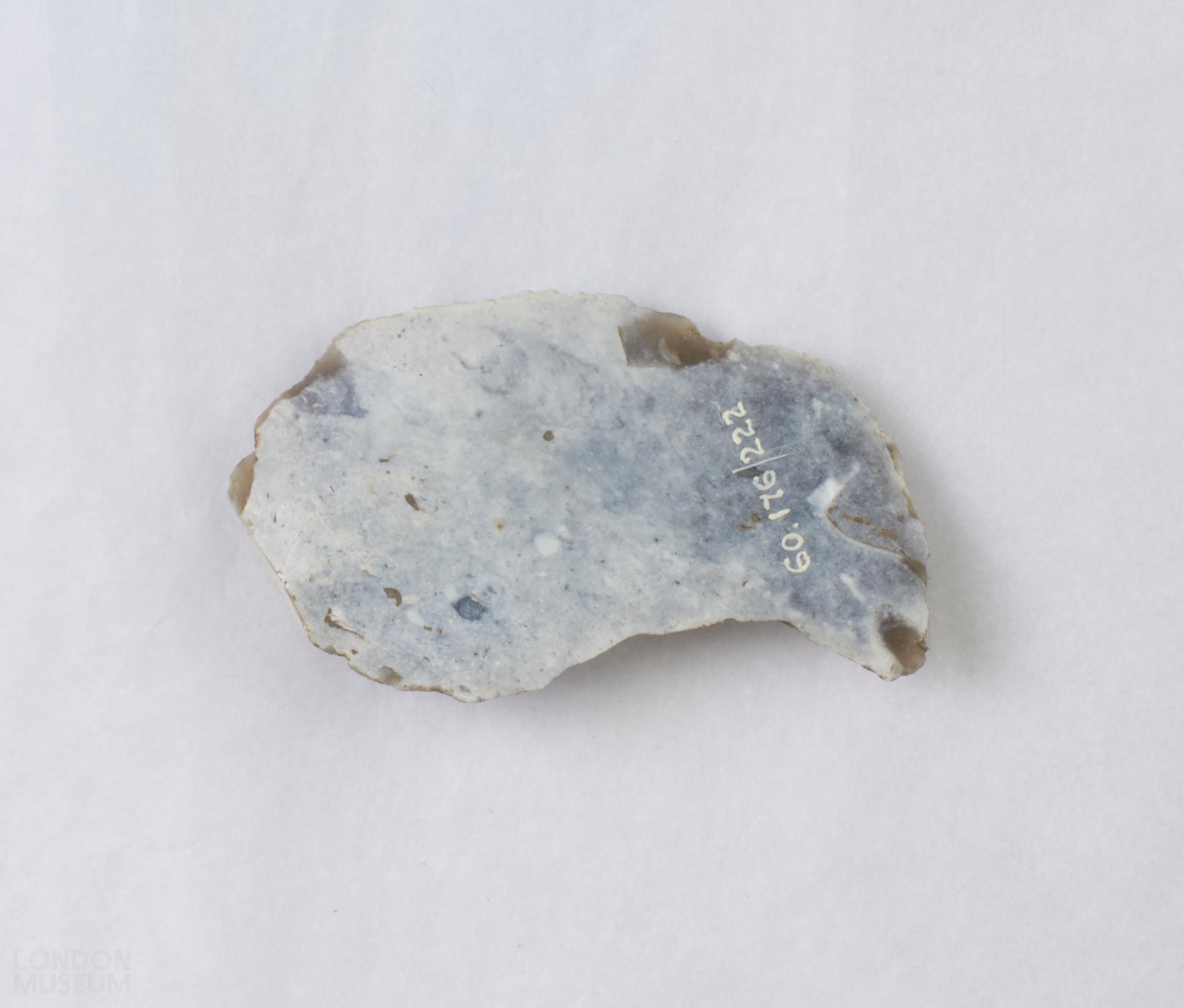 Flint flake with a blue-white patination and some later use or damage marks along one edge.