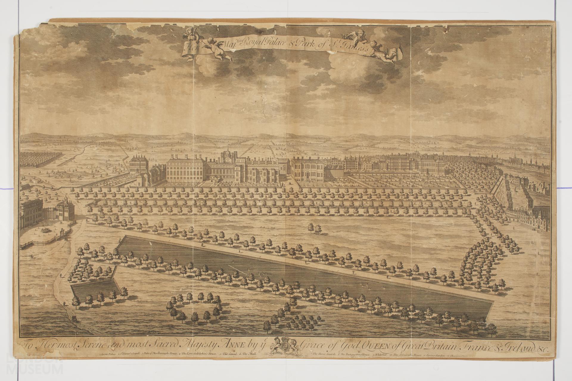 St. James's Park and Palace - a bird's-eye view loooking over the canal in St James's Park and reaching from Buckingham House on the left to Horse Guards on the right, with a key. The engraving is dedicated "To Her most Serene and most Sacred Majesty Anne by ye Grace of God Queen of Great Britain France & Ireland &c." and her dates provide the probable date of the print.