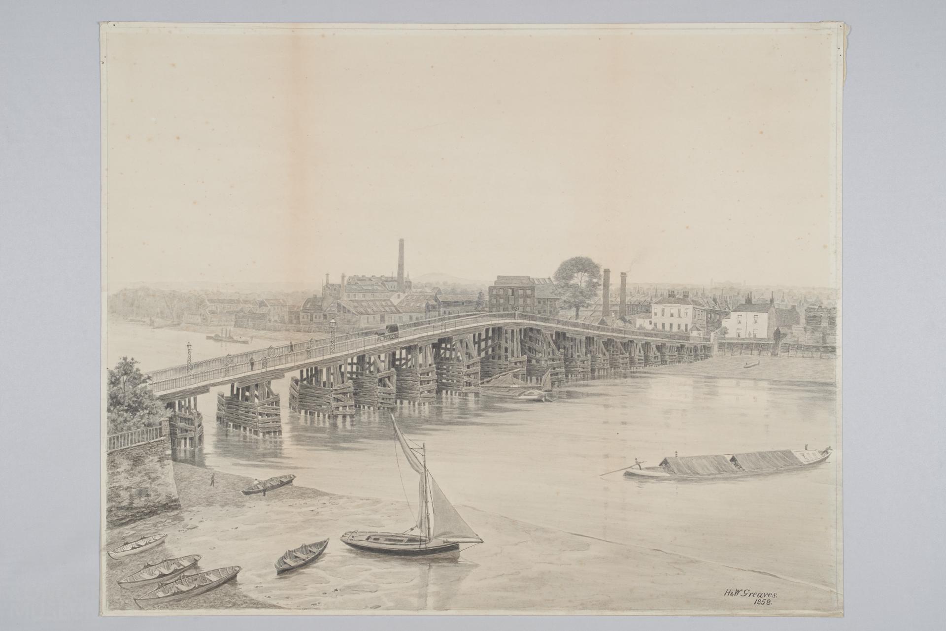 Henry Holland's wooden Battersea Bridge of 1771-2 from Cheyne Walk. It was demolished in 1881 and replaced by the present bridge by Sir Joseph Bazalgette in 1886-90. It is shown at low tide with a laden barge on the river and a sailing barge, with lowered mast, about to go through the bridge. A sailing boat and rowing boats are on the foreshore. On the opposite bank are small houses and industrial premises. Address of the artist is written on the reverse.