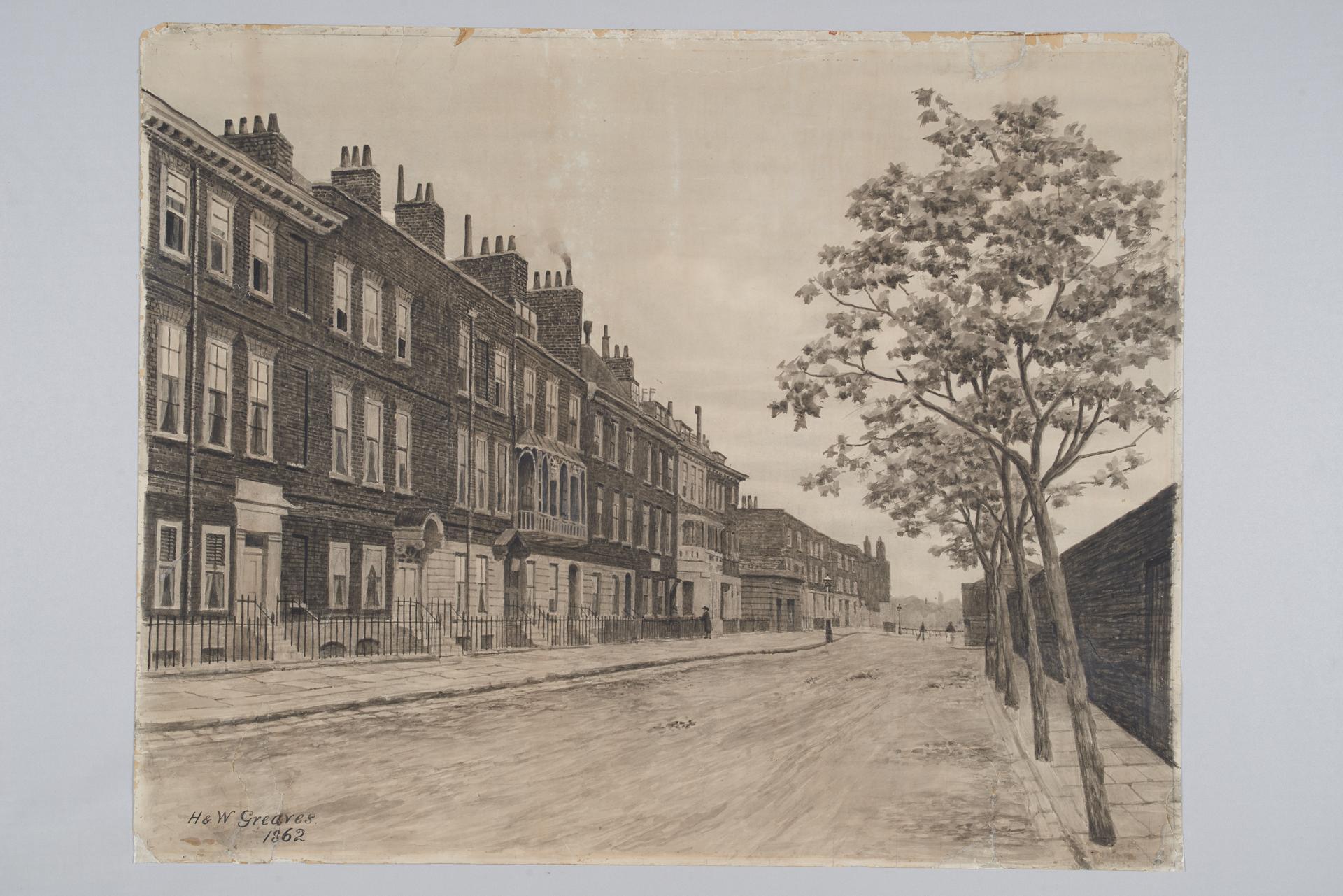 Cheyne Row, Old Chelsea, looking towards the river, with the Queen Anne houses on the west side. Address of the artist written on the reverse.