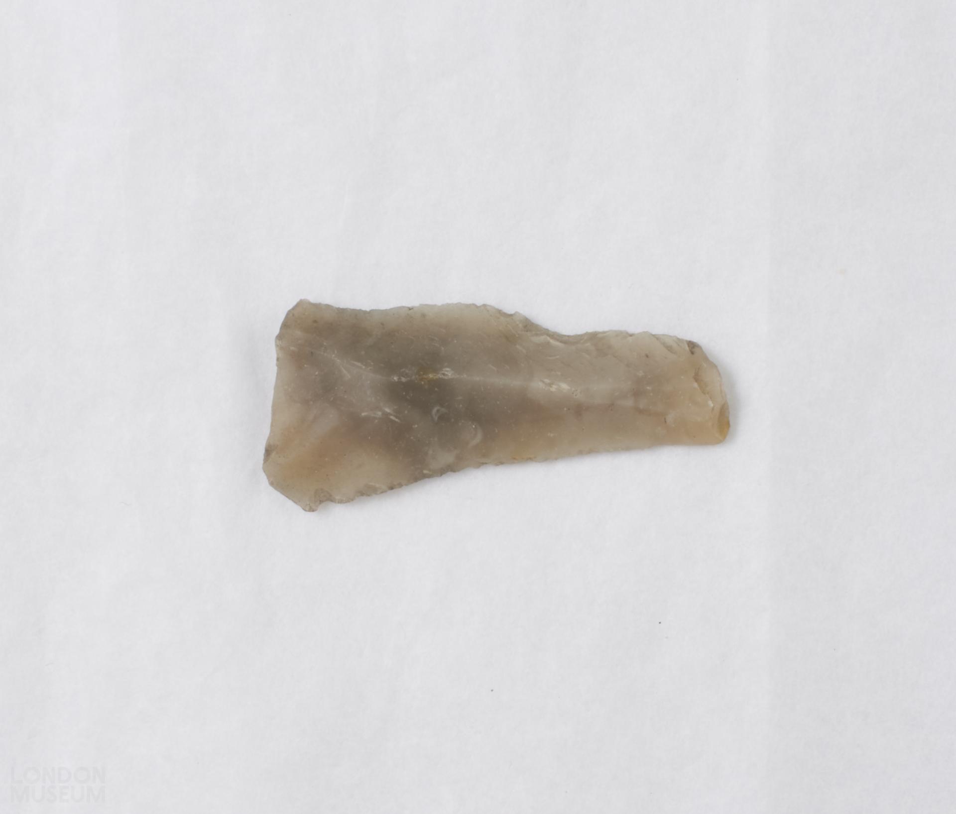 Flint blade. Roughly rectangular shaped. Grey colour. Smooth on one side with a central ridge on the other. Wider at the base and narrows towards the point.