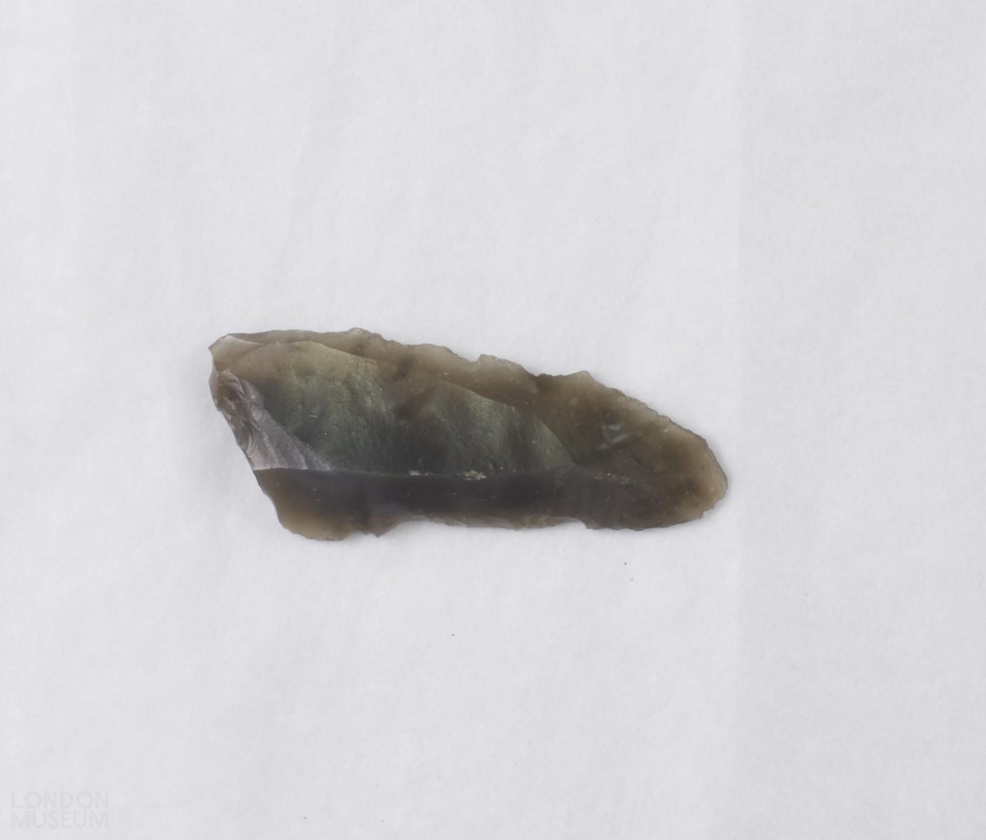 Flint blade. Roughly triangular in shape. Dark grey in colour. Smooth on one side, central ridge on the other. Edges have been slightly retouched.