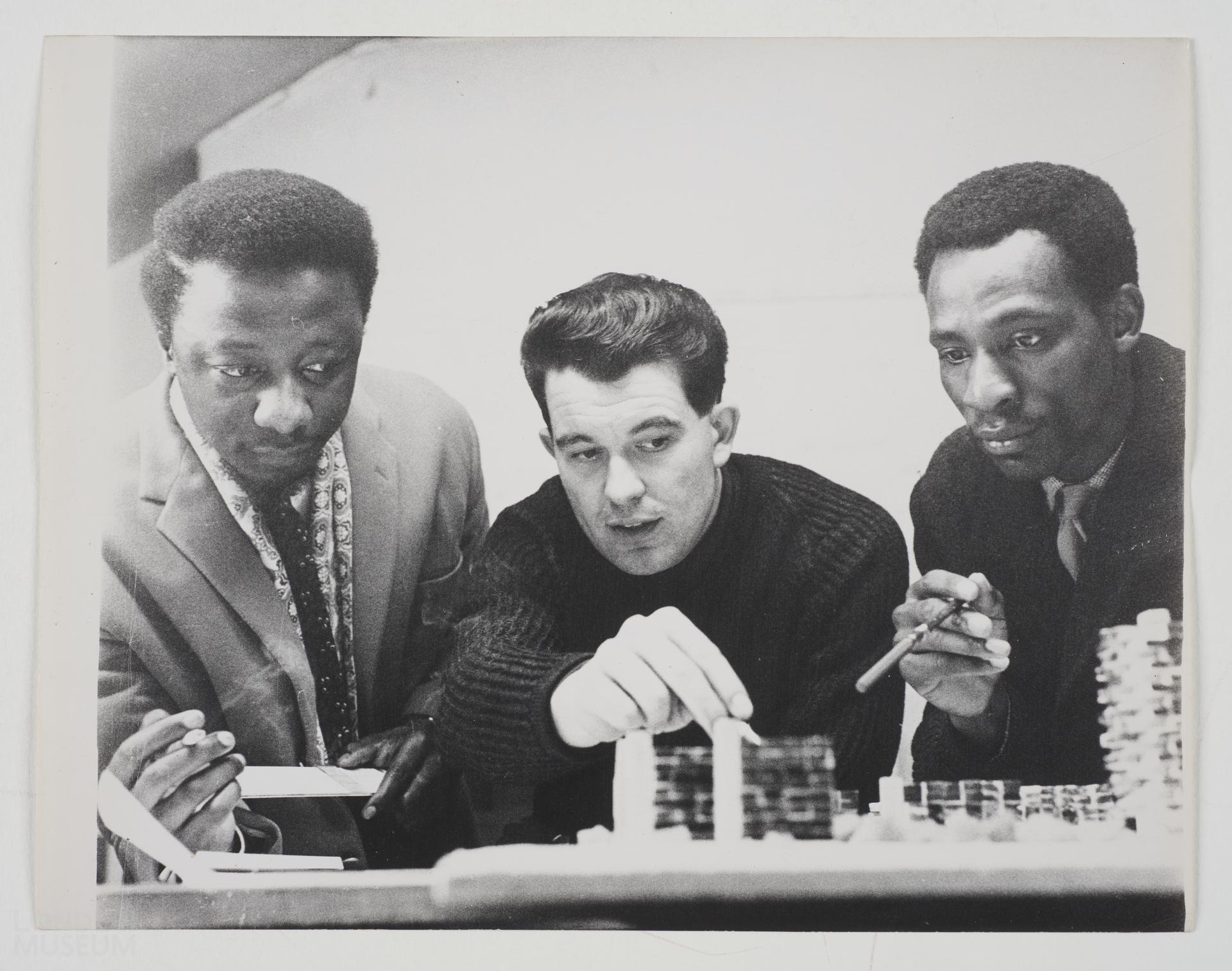 Gelatin silver print, part of the Henry Grant photographs collection. From a group of images of Art and Technology Colleges. The image shows a consultation with a constructional engineering student and architectural students. The three individuals are at a desk pointing to a model of a building in front of them. The handwritten caption on the reverse reads 'Hammersmith Coll.'