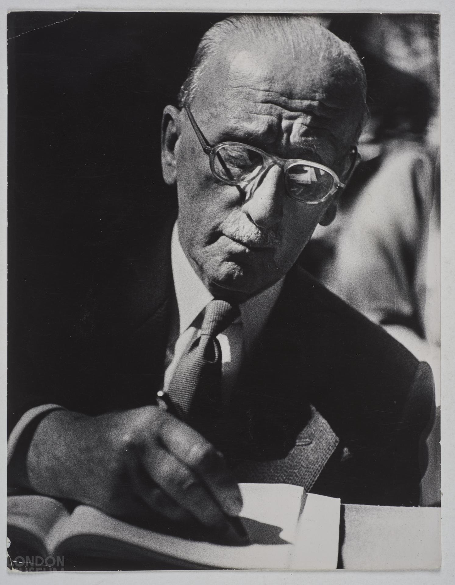 Gelatin silver print, part of the Henry Grant photographs collection. From a group of images of Auctions and Antiques. The image shows an individual, wearing glasses and dressed in a suit and tie, writing in a book. The handwritten caption on the reverse reads 'Sotheby.'