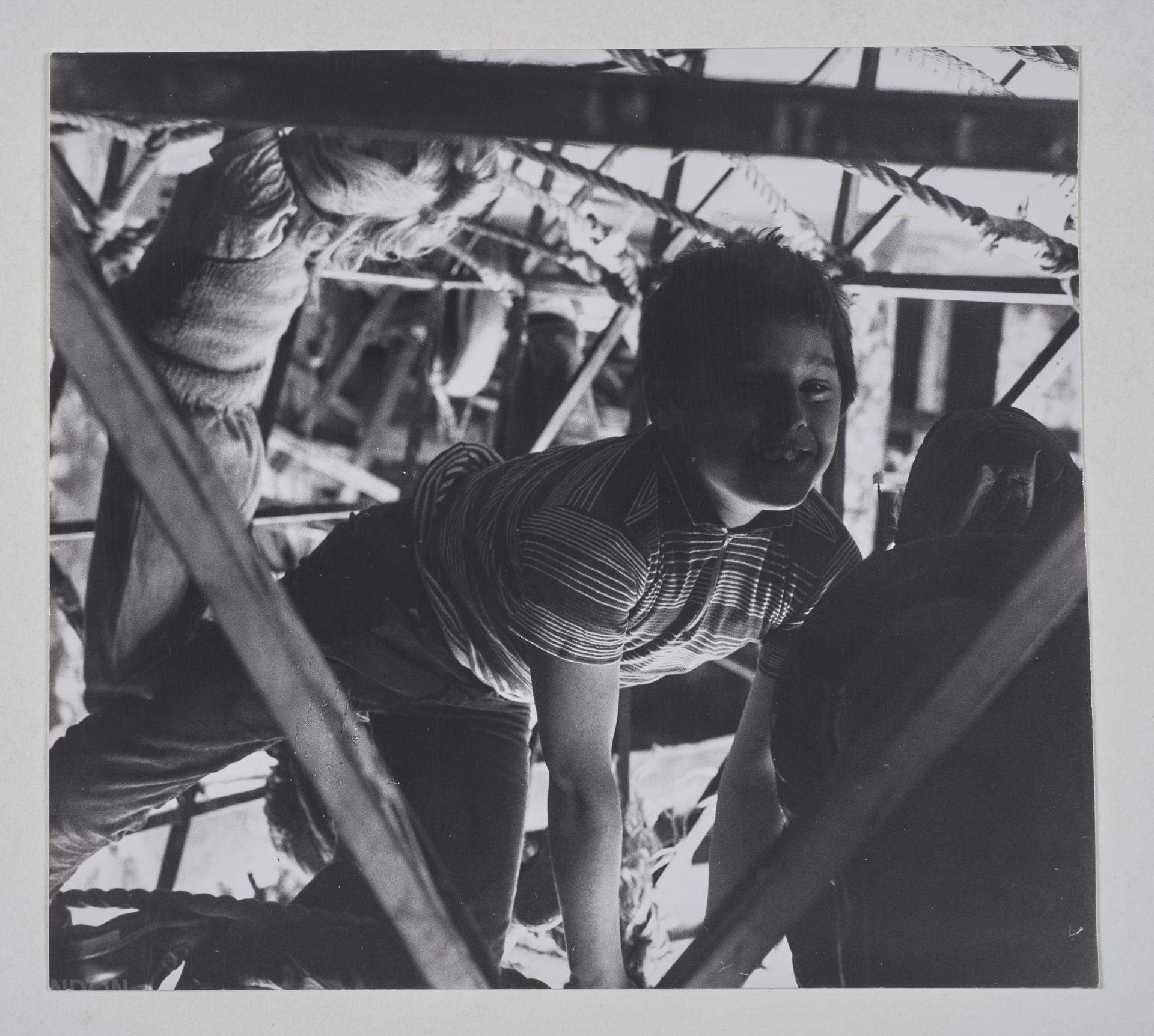 Gelatin silver print, part of the Henry Grant photographs collection. From a group of images of Adventure Playgrounds and Children's Clubs, 1972-1973. The image shows a child, wearing a striped t-shirt, in a climbing frame at World's End Adventure Playground in Chelsea, 06/1972.