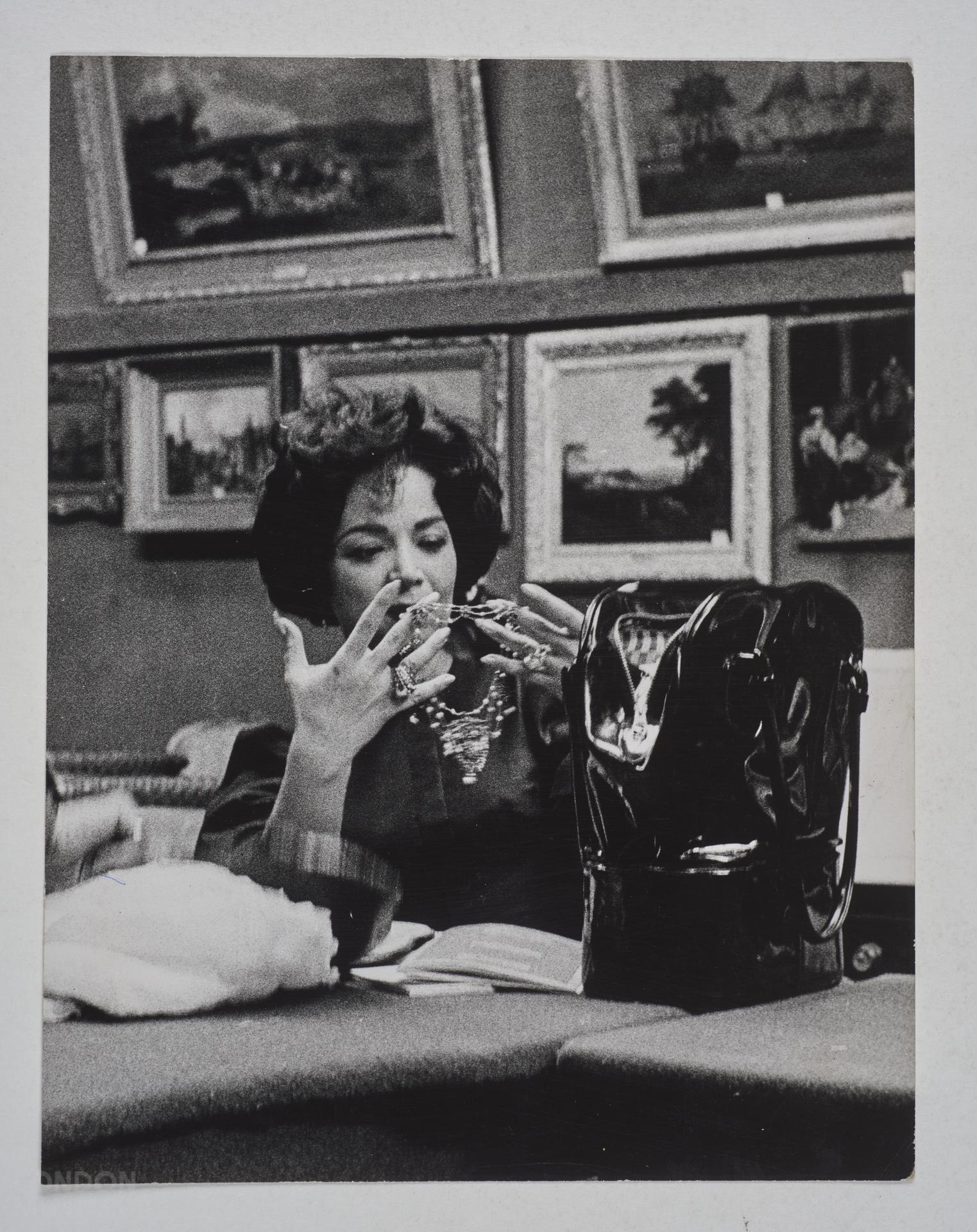Gelatin silver print, part of the Henry Grant photographs collection. From a group of images of Auctions and Antiques. The image shows a close up of an individual holding and examining a necklace at Sotheby's in London.