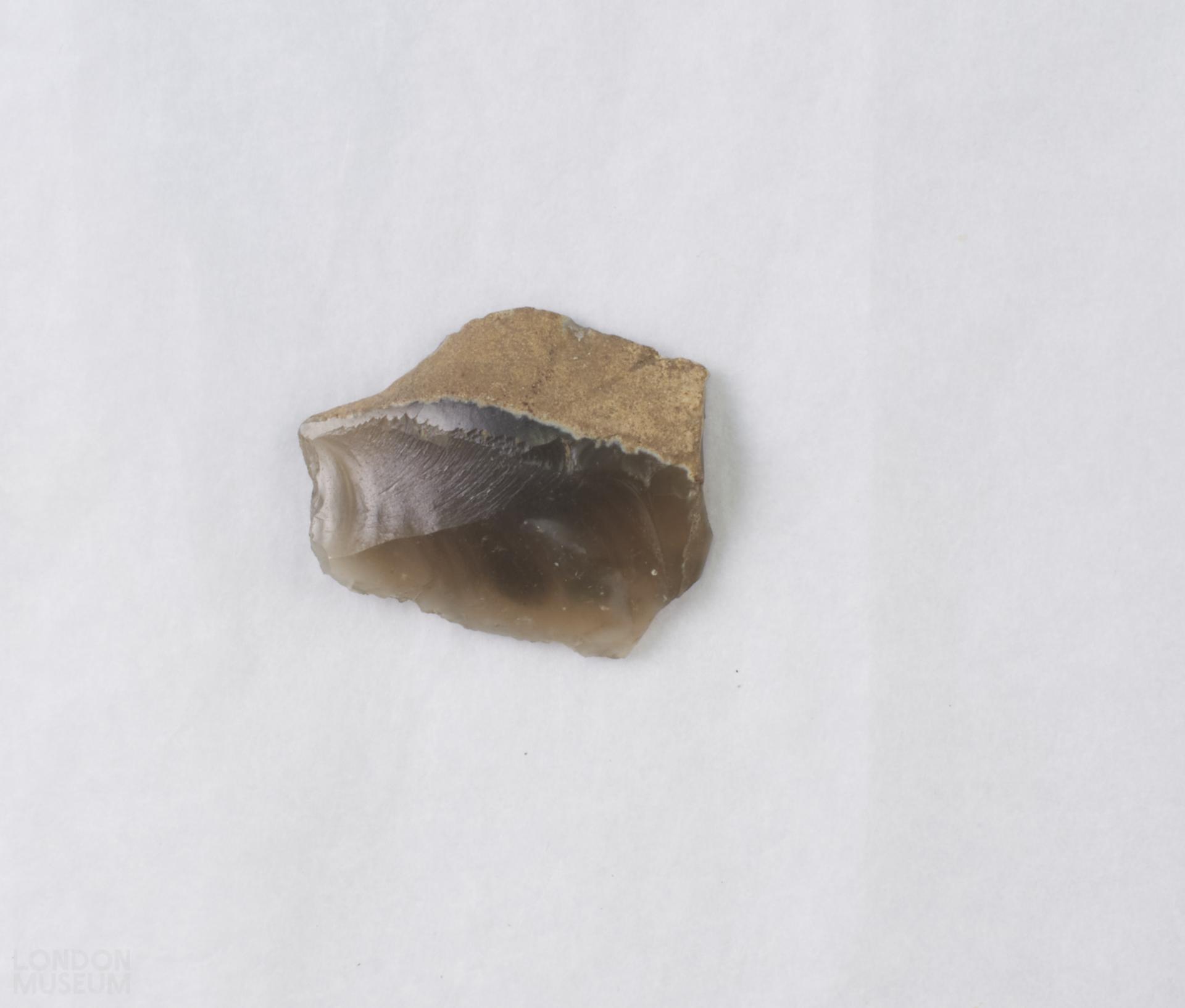 Flint flake, possibly retouched. Partial cortex on the dorsal side. Dark grey in colour.