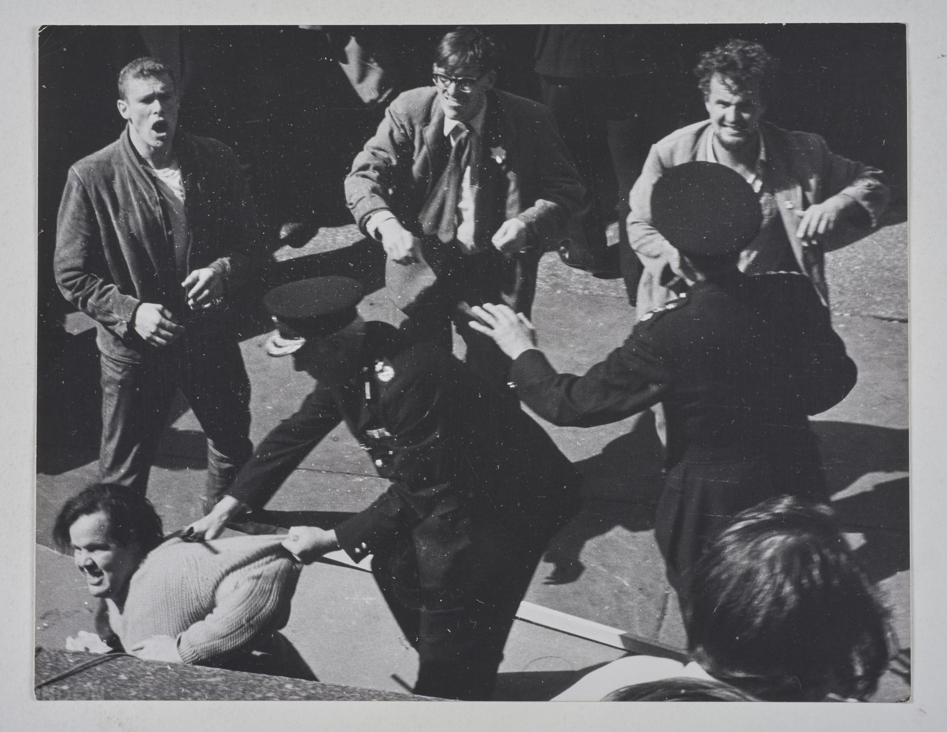 Gelatin silver print, part of the Henry Grant photographs collection. From a group of images of Demonstrations and Rallies. The image shows Londoners protesting against a "Mosley" rally in Trafalgar Square, 1962, in the presence of policemen. One of the police officers is grabbing hold of an individual.