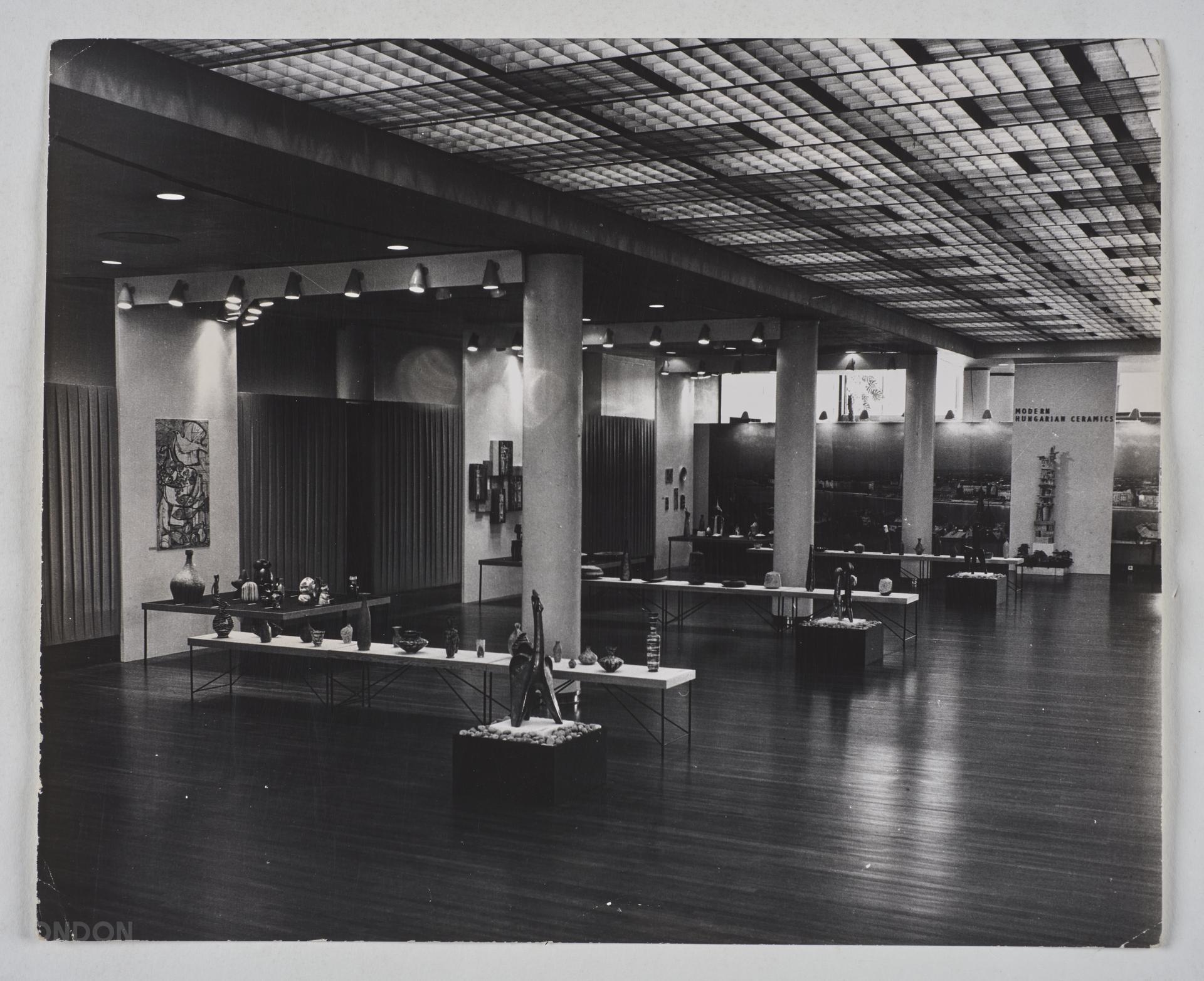 Gelatin silver print, part of the Henry Grant photographs collection. From a group of images of the Hungarian Ceramics Exhibition, 09/1963 at the Royal Festival. The image shows objects on display at the modern Hungarian ceramics exhibition at the Festival Hall.