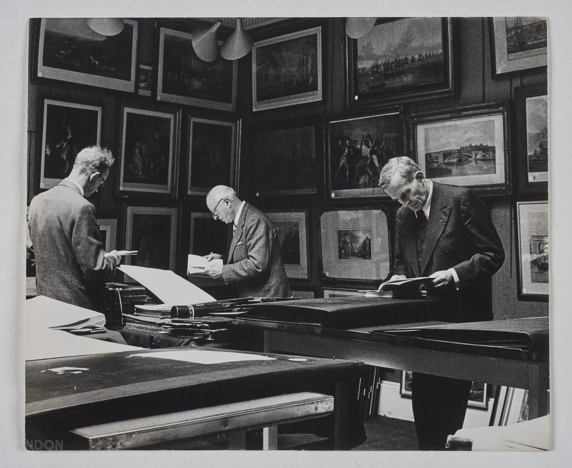 Three men consulting sales catalogues at Sotheby's ahead of an auction. Works of art adorn the show room walls. Grant's handwritten caption on the back of the print reads 'Sotheby's. Preview - evidently serious students not casual droppers-in.'