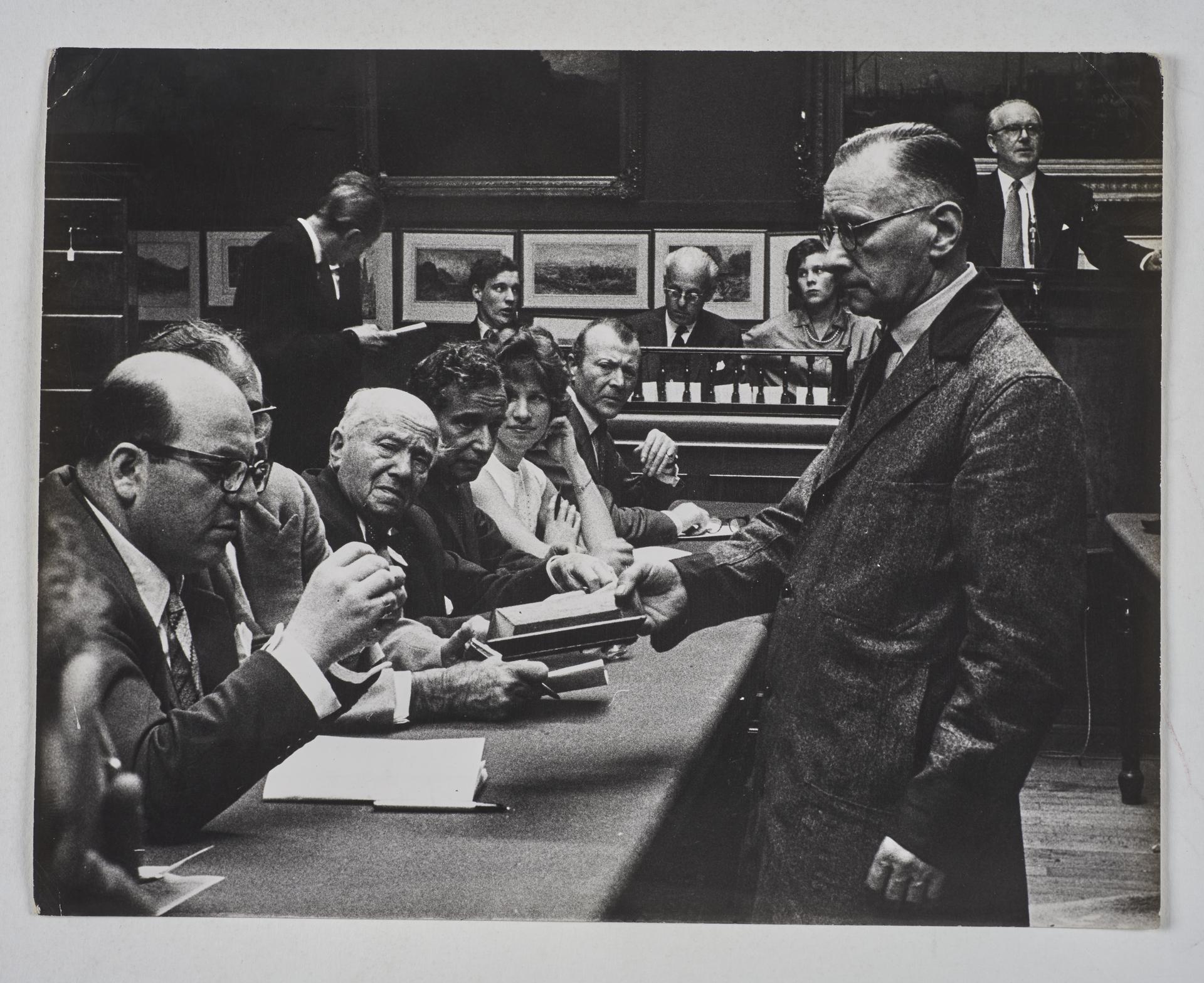 Gelatin silver print, part of the Henry Grant photographs collection. From a group of images of Auctions and Antiques. The image shows individuals taking it in turns to examine a piece of jewellery before bidding begins. Another individual is holding out a tray to pass the jewellery around in. The typed caption attached on the reverse reads 'Sotheby's. The piece of jewellery is brought round for examination before the bidding for it starts.'
