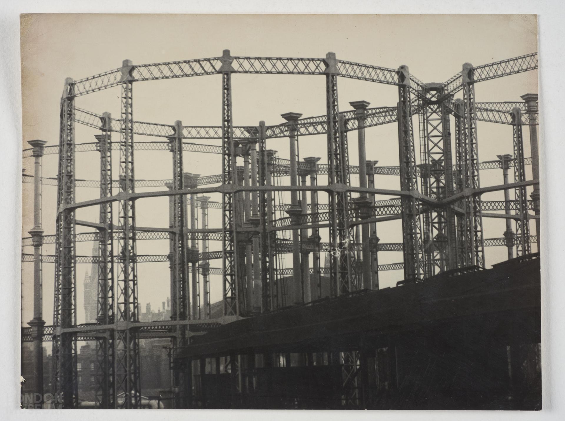Gelatin silver print, part of the Henry Grant photographs collection. From a group of images of London Landmarks and street life. The image shows a view of gas holders in London.